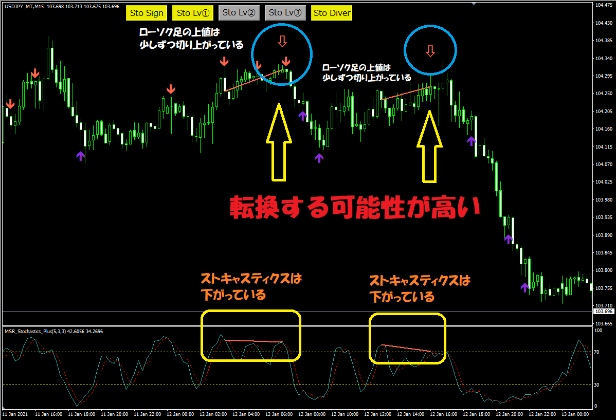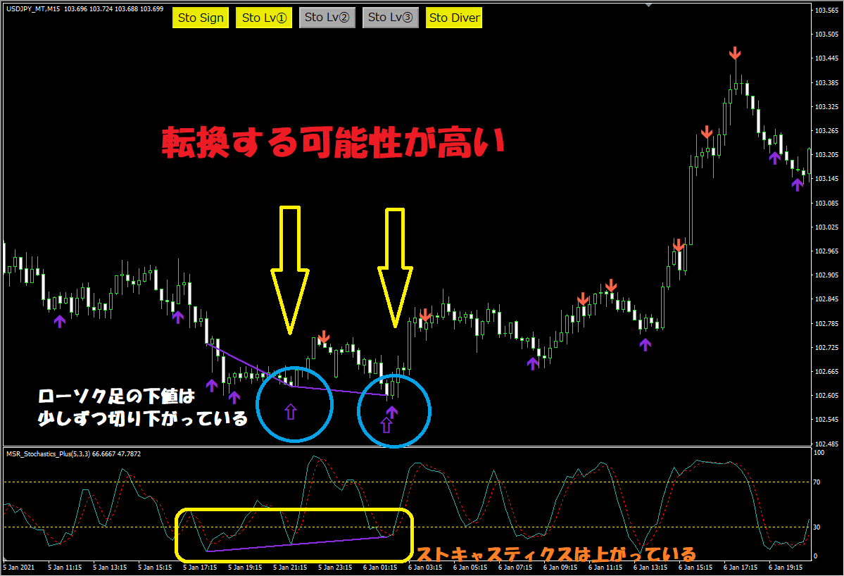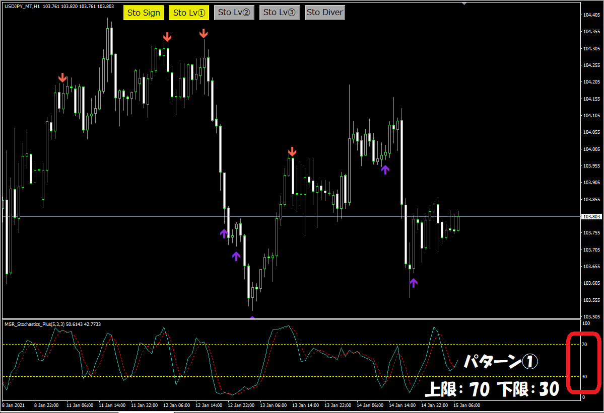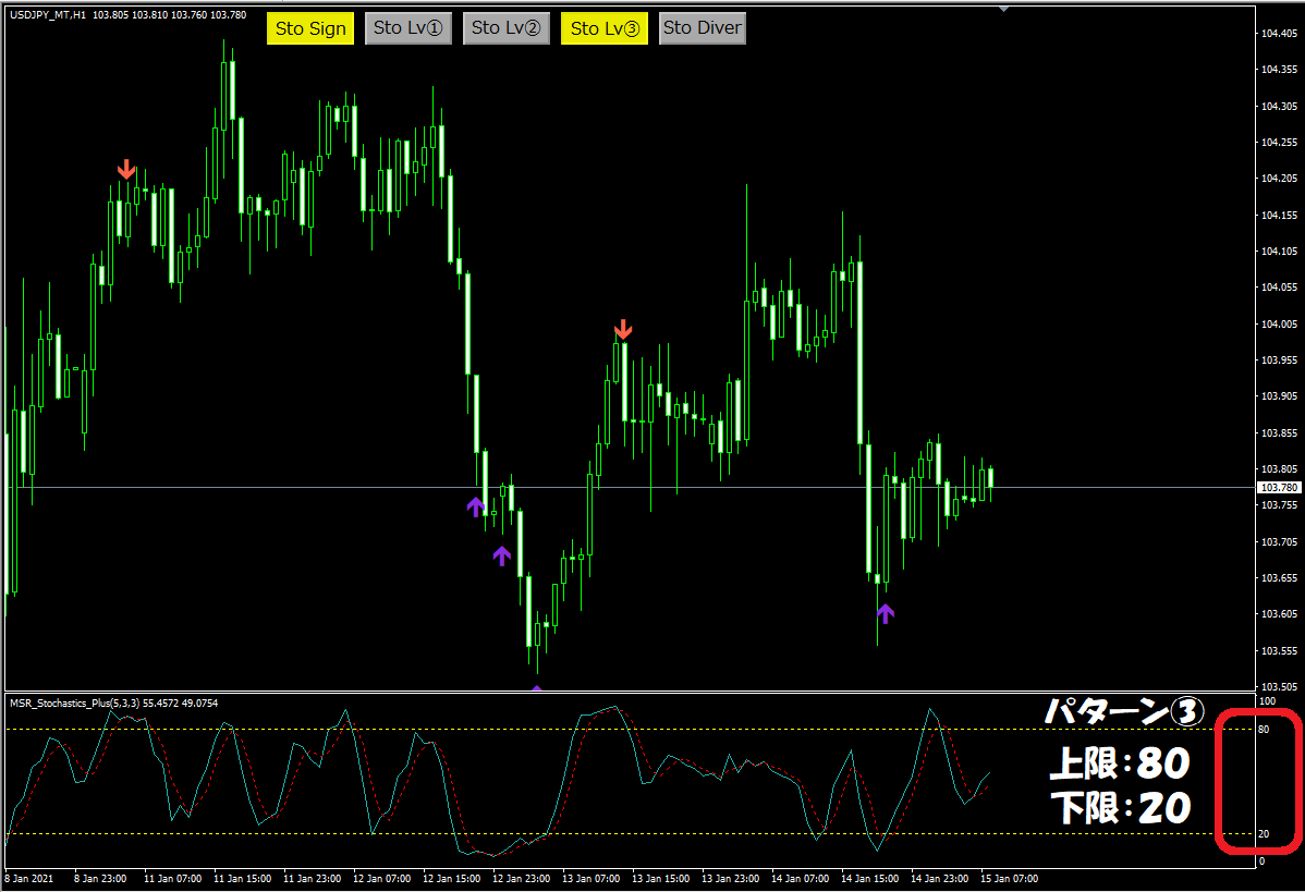 レベルの範囲を超えた位置でクロスをすると逆張りサインを表示します!3種類のレベルを設定でき、異なる時間足のストキャスを表示することも可能!ダイバージェンス・リバーサル判定で反転を先読み!