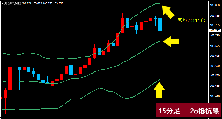 サンプル15分足チャート画像 5分足エントリーで確認する15分足では、ロウソク足がボリンジャーバンドにも触れておらず、未だ下がる可能性があります。