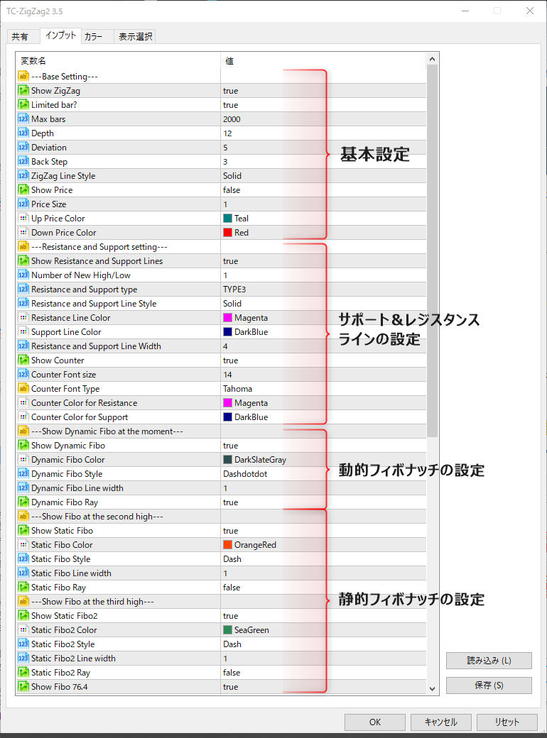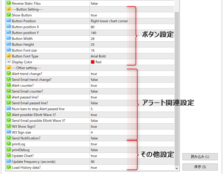 ---Base Setting--- ■Show ZigZag:ZigZagを表示するかを設定します。 ■Limited bar?:使用するバーを制限するかどうか ■Max bars:使用するバーの本数を設定します。 ※過去検証をする場合にはここの値を増やしてください。 ■Depth:ZigZagで使用するDepthを設定します。 ■Deviation:ZigZagで使用するDeviationを設定します。 ■Back Step:ZigZagで使用するBack Stepを設定します。 ■ZigZag Line Style:ZigZagで使用しているラインのタイプを設定します。 ■Show Price:価格を表示するかを設定します。 ■Price Size:表示する価格の大きさを設定します。 ■Up Price Color:高値の色を設定します。 ■Down Price Color:安値の色を設定します。 ---Resistance and Support setting--- ■Show Resistance and Support Lines:レジスタンスとサポートラインを表示するかを設定します。 ■Number of New High/Low:レジスタンスとサポートラインを表示するための高値安値の回数を設定します。 ■Resistance and Support type :レジスタンスとサポートラインでタイプを設定します。 TYPE1:レジスタンスー前回高値を更新した際にもラインを引きます。 サポートー前回安値を更新した際にもラインを引きます。 TYPE2:レジスタンスー前回高値を更新した時もラインを引きません。 サポートー前回安値を更新した時もラインを引きません。 TYPE3:押し安値、戻り高値にラインを引きます。 ■Resistance and Support Line Style:使用しているラインのスタイルを設定します。 ■Resistance Line Color:レジスタンスラインの色を設定します。 ■Support Line Color:サポートラインの色を設定します。 ■Resistance and Support Line Width:ラインの太さを設定します。 ■Show Counter:カウンターを表示するかを設定します。 ■Counter Font size :カウンターのフォントサイズを設定します。 ■Counter Font Type:カウンターのフォントの種類を設定します。 ■Counter Color for Resistance:レジスタンスカウンターの色を設定します。 ■Counter Color for Support:サポートカウンターの色を設定します。 ---Show Dynamic Fibo at the moment--- ■Show Dynamic Fibo:動的フィボナッチを表示するかを設定します。 ■Dynamic Fibo Color :ラインの色を設定します。 ■Dynamic Fibo Style:使用しているラインのタイプを設定します。 ■Dynamic Fibo Line width:ラインの太さを設定します。 ■Dynamic Fibo Ray:線を左に延長して表示するかを設定します。 ---Show Fibo at the second high--- ■Show Static Fibo:静的フィボナッチを表示するかを設定します。 ■Static Fibo Color:ラインの色を設定します。 ■Static Fibo Style:使用しているラインのタイプを設定します。 ■Static Fibo Line width:ラインの太さを設定します。 ■Static Fibo Ray:線を左に延長して表示するかを設定します。 ---Show Fibo at the third high--- ■Show Static Fibo2:2つめの静的フィボナッチを表示するかを設定します。 ■Static Fibo2 Color:ラインの色を設定します。 ■Static Fibo2 Style:使用しているラインのタイプを設定します。 ■Static Fibo2 Line width:ラインの太さを設定します。 ■Static Fibo2 Ray:線を左に延長して表示するかを設定します。 ■Show Fibo 76.4:フィボナッチで76.4のラインを引くか設定します。 ■Reverse Static Fibo:静的な逆フィボナッチラインを引くか設定します。 ---Button Setting--- ■Show Button:ボタンを表示するかを設定します。 ■Button position X:ボタンの位置Xを設定します。 ■Button position Y:ボタンの位置Yを設定します。 ■Button Width:ボタンの幅を設定します。 ■Button Height:ボタンの高さを設定します。 ■Button Font size:ボタンで使用しているフォントサイズを設定します。 ■Button Font Type:ボタンで使用しているフォントタイプを設定します。 ■Display Color:表示の色を設定します。 ---Other setting--- ■Alert trend change?:トレンド変換時にアラート表示するかを設定します。 例: Alert: C1 TC Buy Chance Alert: C1 TC Sell Chance ※Cはカウンター トレンド転換時はカウンターは1になります。 ■Send Email trend change?:トレンド転換時にメールを送信するかを設定します。 ■Alert counter?:トレンド継続時にアラート表示するかを設定します。 Alert: C3 Buy Chance Alert: C4 Sell Chance ※Cはカウンター ZigZag谷と山の数と考えてください。 ■Send Email counter?:トレンド継続時にメールを送信するかを設定します。 ■Alert passed line?:押し安値、戻り高値にラインを価格がクロスしたときにアラート表示するかを設定します。 例: Alert: C2 Resistance line was crossed Alert: C3 Support line was crossed ■Num bars to stop Alert passed line:クロスした後、ローソク足何本アラート表示しないかを設定します。 ■Alert possible Elliott Wave 3?:エリオット3波発生の可能性でアラート表示するかを設定します。 Alert: C2 W3 Buy Chance Alert: C2 W3 Sell Chance ※こちらはあくまで後出しのサインになりますのでエントリー候補の参考としてください。 ※Cはカウンター ZigZag谷と山の数と考えてください。 ■Send Email possible Elliott Wave 3?:エリオット3波発生の可能性でメールを送信するかを設定します。 ■W3 Show Sign?:エリオット3波発生の可能性でサインを表示するかを設定します。 ■W3 Sign size:サインのサイズを設定します。 ■Send Notific