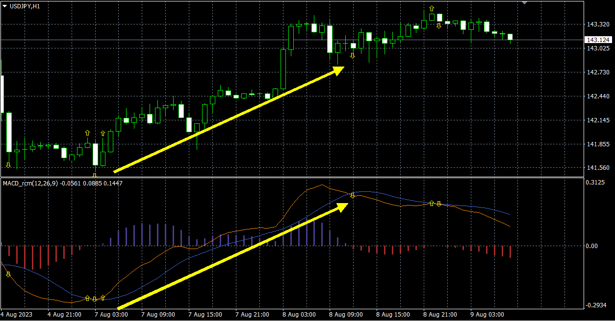 オレンジの線が、MACD、青がMACDシグナル、差分を棒グラフで表示しています。※黄色い太線の矢印はオブジェクトを書き足しています。