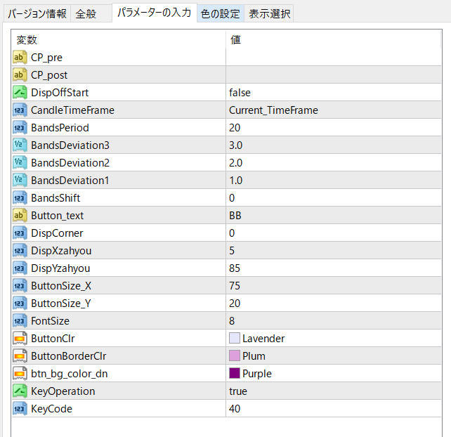 また、こちらのインジケーターは、チャート適用時とタイムフレーム切替時に初めから非表示とすることができます。 パラメーター設定で、通常モード(最初から表示状態)と選択できるようにしていますので、普段は素のチャートを見ることが多い方、ボリンジャーバンドの状況を見るのはエントリー前だけ、というような使い方をされる方は、初期状態で非表示モードを選択されると便利かと思います。