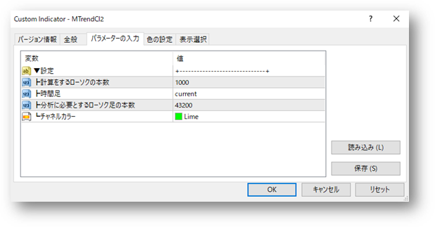 ■インジケータ設定例 ■パラメータの入力画面 ■インジケータ導入方法 MT4ファイルメニューからデータフォルダを開き、MQL4フォルダの中に「indicators」というフォルダがあるのでそこにダウンロードしたファイルをコピーします。 MT4を再起動した後、挿入→インディケータ→カスタムでダウンロードしたインディケータを選ぶとチャートに反映されます。