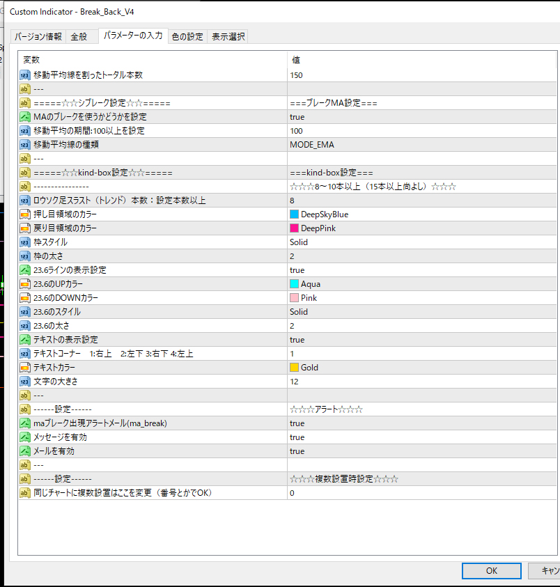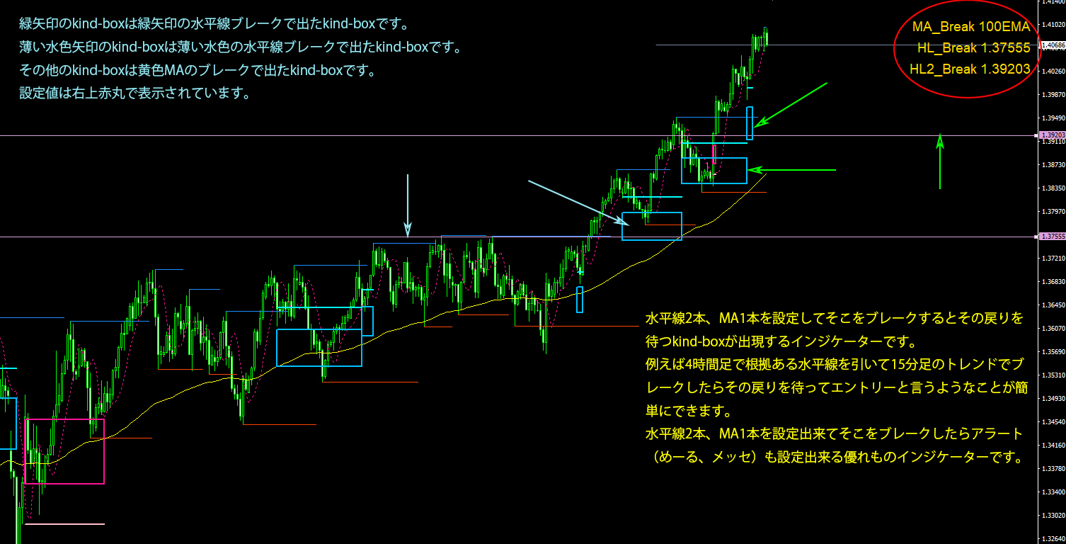 Total_Method_CSetでの実践的手法のMAブレークからの戻りのkind-boxを待ってのエントリーという手法を検証していたら、このブレークするMAは人それぞれの考えのMAがあったり、またブレークと言えば根拠ある水平線であったりするということでMA1本、水平線2本を設定出来てそこをブレークし戻りでkind-boxを出すというインジケータを開発致しました。