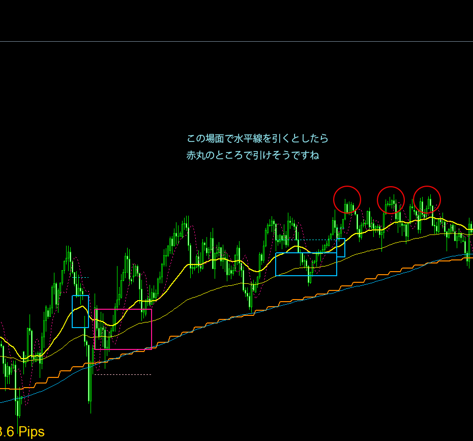 根拠ある水平線は大きい時間足で引くほど根拠高くなります。その時間足で水平線引いて待つのは15分足、1時間で待つとか両方の時間足でも待てます。