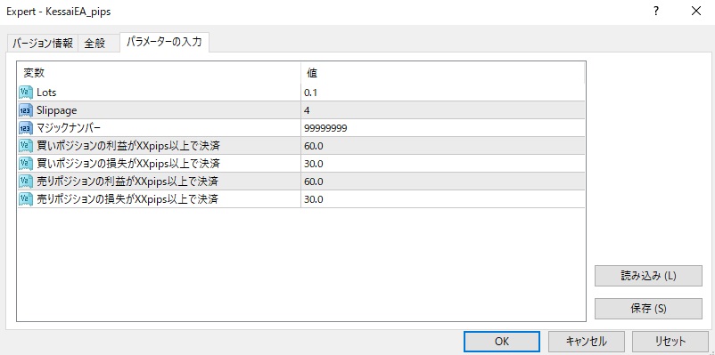 決済のみを自動で行います 「パラメーター入力」タブで数値を設定して下さい 手動でのポジションや他のEAのポジションにも有効です 特定のEAにのみ適用したい場合は同じマジックナンバーを入力して下さい。 決済条件はお好みで設定可能。 値をダブルクリックして変更して下さい。 裁量トレードで決済だけ自動でやってくれたら便利だなって思ったので作ってみました。 利確も損切りも設定した条件で自動でやってくれます。 このEAを使えば、損切りする決心が付かず、タイミングを逃して大損してしまうなんてことも防げます。 決済専用EAの機能 ・手動でのポジションや他のEAのポジションを、予め設定しておいた条件で自動決済してくれる ・適用チャートの通貨以外にも有効 ・マジックナンバー設定で他のEAの自動決済が可能 エントリーは裁量、エグジットは自分で決めたルールで自動決済 決済のみを自動で行ってくれるEAを作ってみました。 エントリーは裁量、決済は非裁量というトレードができます。 私はMT4でエントリー時にMT4で手動でやっていたのですが、 めんどくさくなって指値を入れなかったり忘れてたりして大きな損失を出してしまったことがあります。 この決済専用EAなら予め設定したルールで利益確定・損切りを自動で行ってくれるのでそんなこともなくなります。 決済をEAで自動化するメリットとは? トレーダーが大きな損失を出してFXから退場してしまう要因の多くがエグジット(決済)にあります。 これには人間心理が大きく関わっています。 人間の心理は、 利益を手にしている場合、利益を残すことを優先する。 一方、損失がある場合は、損失を減らそうとする傾向があります。 FXや株で言うと、 少しでも利益があればすぐ利確、少しでも損があれば損失を回避したくてもなかなか損切りできない。 これが多くの人がFXや株式投資で負けてしまう原因です。 ではどうしたら投資で負けにくくなるかというと、 一定のルールを決めてそのルールを厳格に守ることです。 だから利確損切りには感情を持ち込まず機械的に処理するのがいいのです。 このツールを使えば、指値と逆指値を入れる作業を自動でやってくれます。 決済専用EAはこんな人にオススメ ・損切りをなかなかできずに大きな損失を出してしまったことがある ・いちいち指値・逆指値設定するのがめんどくさい ・EAを使うのはロジックが分からないから不安だ 注意事項 ・MT4でのみ作動します。 ・本ツールの利用において万が一不利益を被った場合でも保証はできかねます。 ・EAを24時間稼働させるために、VPS(仮想専用サーバー)の利用を推奨しています。