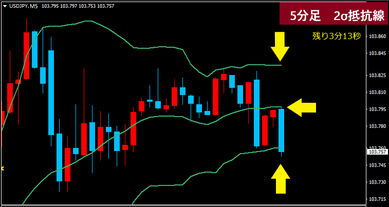 このような場合、5分足より上のロウソク足の状況、移動平均線・ボリンジャーバンド等に、実線が触れているか等を確認しエントリータイミングを計ります。