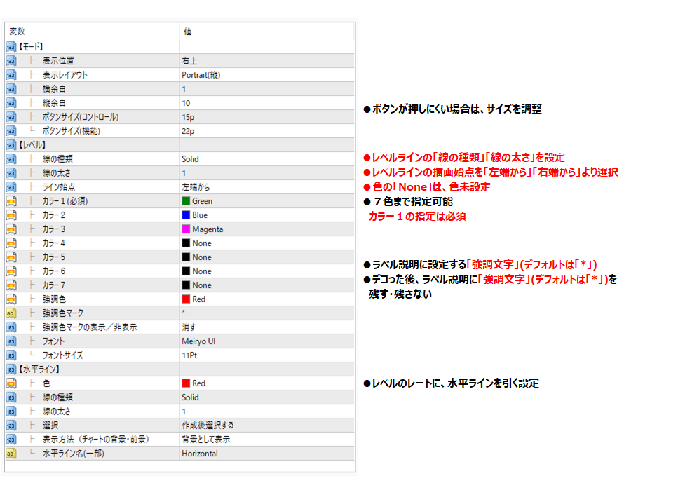 ・標準のFR,FEのレベルラインは消せますが、レベル説明文字が消えません(右端に黒色で表示されます)