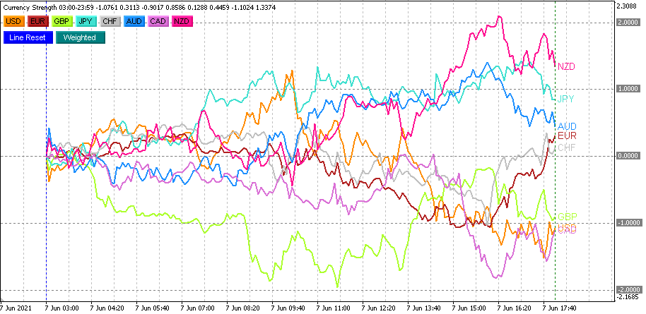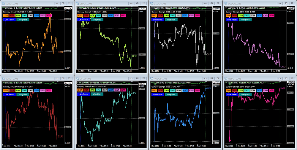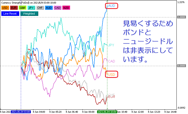 8通貨の強弱を比較表示するだけに留まらず、ボタン操作で簡単に表示通貨を選べるので、1つの通貨の強弱トレンドを観察したり、少数の通貨に絞った強弱比較・分析なども可能です。