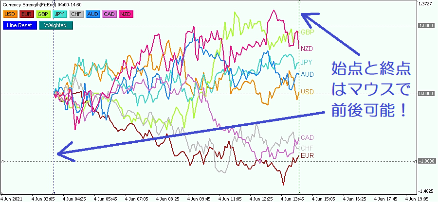 例えばロンドン市場の時間帯に入り、大きなトレンドが始まってからの通貨の強弱を比較したい、といったような場合にチャート開始時刻を移動させて、手軽に比較できるので重宝します♪