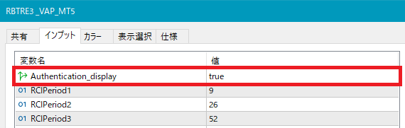 下図の通り、"DLLの使用を許可する" にチェックを入れる必要があります。 ツール → オプション → エキスパートアドバイザ 3-MT5_Option_DLL_Settings_20210330.png 4-RBTRE3_DLL_Settings_20210330.png 5-RBTRE3_Settings_20210330.png 星印や矢印の発生条件に関する設定項目  RCIPeriod1: 1本目のRCIの期間  RCIPeriod2: 2本目のRCIの期間  RCIPeriod3: 3本目のRCIの期間  RCIUpperLimit: RCIの買われ過ぎライン  RCILowerLevel: RCIの売られ過ぎライン 星印や矢印の表示位置に関する設定項目  星印や矢印の表示位置がローソク足に近すぎて見にくかったり、逆に遠すぎて場合によっては表示位置が画面外になってしまう場合もあります。これらの印を表示する高さを、下記の設定項目の値を調整することにより、修正することができます。値が大きいほど表示位置はローソク足から離れていきます。    (初期設定では空色の)星印→ SkyBlueStar    (初期設定では空色の)矢印→ SkyBlueArrow    (初期設定では赤色の)星印→ RedStar    (初期設定では赤色の)矢印→ RedArrow  また、下記の項目の値を変更することにより、星印や矢印の形状を変更することができます。    (初期設定では空色の)星印 → Arrowtype1    (初期設定では空色の)矢印 → Arrowtype2    (初期設定では赤色の)星印 → Arrowtype3    (初期設定では赤色の)矢印 → Arrowtype4  なお、星印や矢印あるいはその代わりとして使用できる記号とそれに対応する番号は下表の通りです。 アラート機能に関する設定項目 UseAlert:  下図のようなアラートダイアログによりサイン発生を知らせる機能を使用する場合には true、使用しない場合には false を選択する。 6-RCIRE_RBTRE_M5_Alert1_20210329.png UseMail:  メールによりサイン発生を知らせる機能を使用する場合には true、使用しない場合には false を選択する。 UseSound:  アラート音によりサイン発生を知らせる機能を使用する場合には true、使用しない場合には false を選択する。 BuySoundFile:  上向きサイン発生時のアラート音に使うサウンドのファイル名を入力する。 SellSoundFile:  下向きサイン発生時のアラート音に使うサウンドのファイル名を入力する。 UsePush:  プッシュ通知によりサイン発生を知らせる機能を使用する場合には true、使用しない場合には false を選択する。