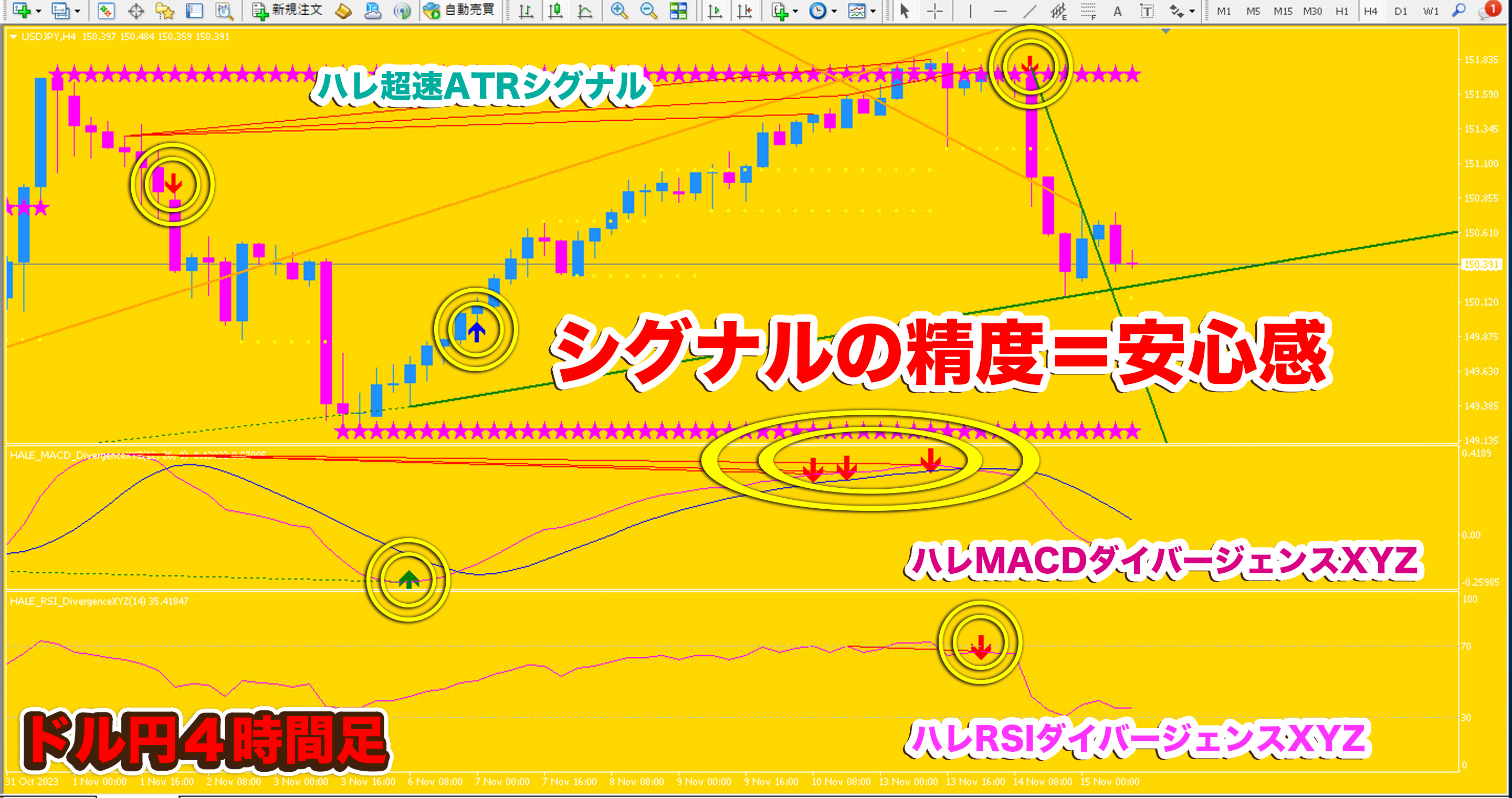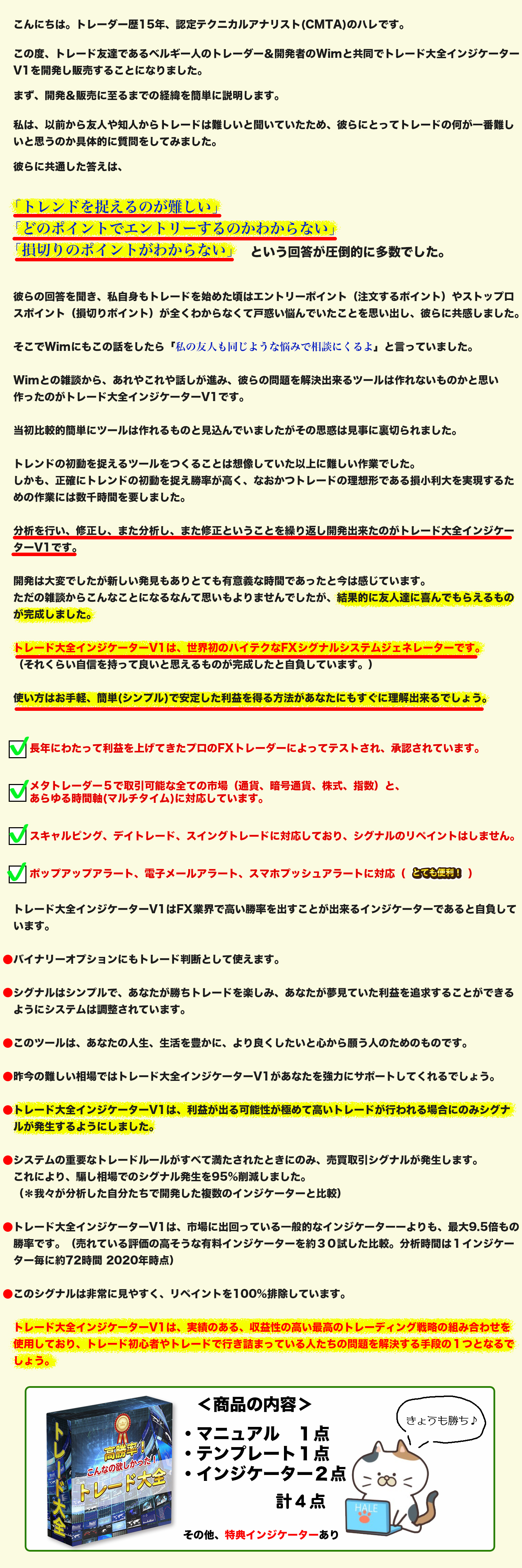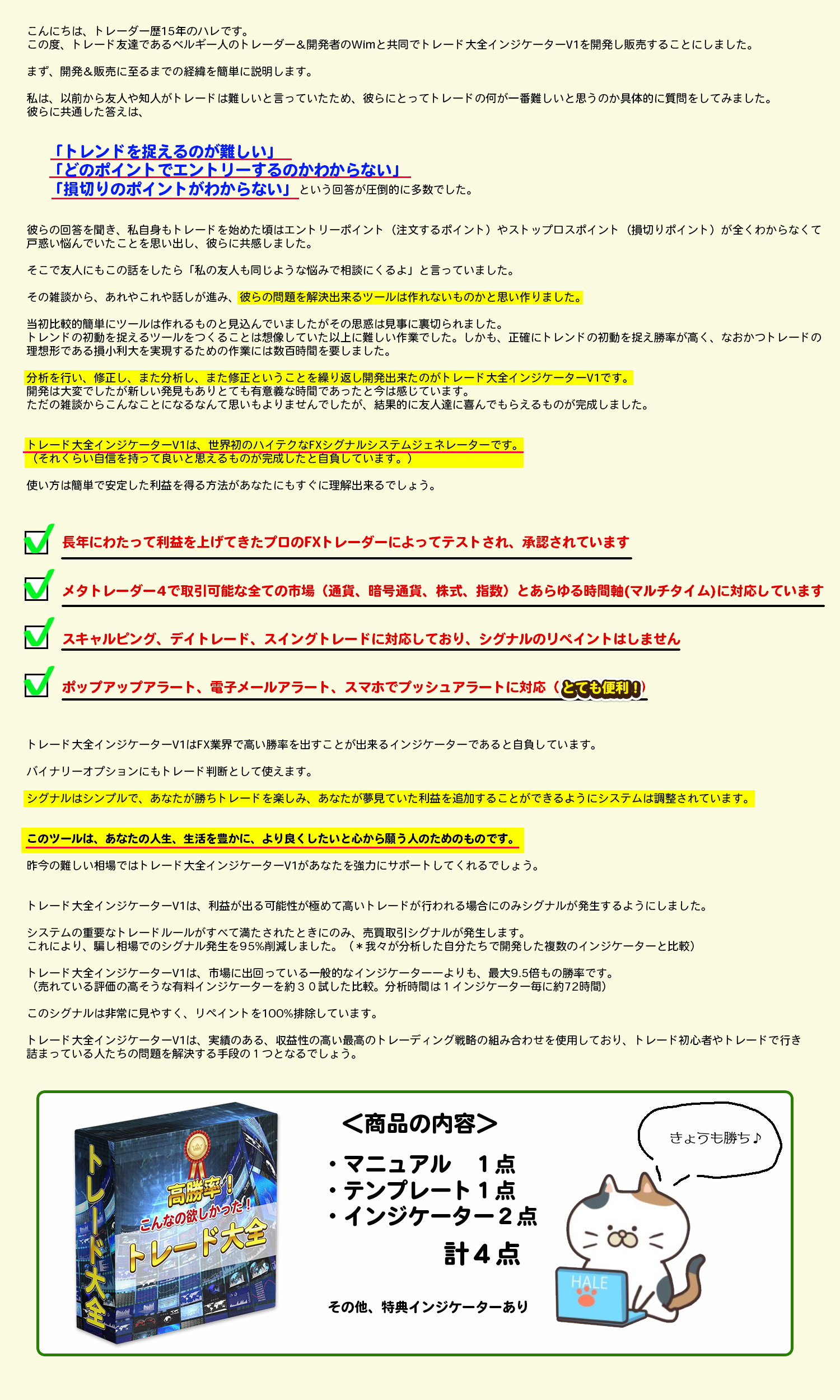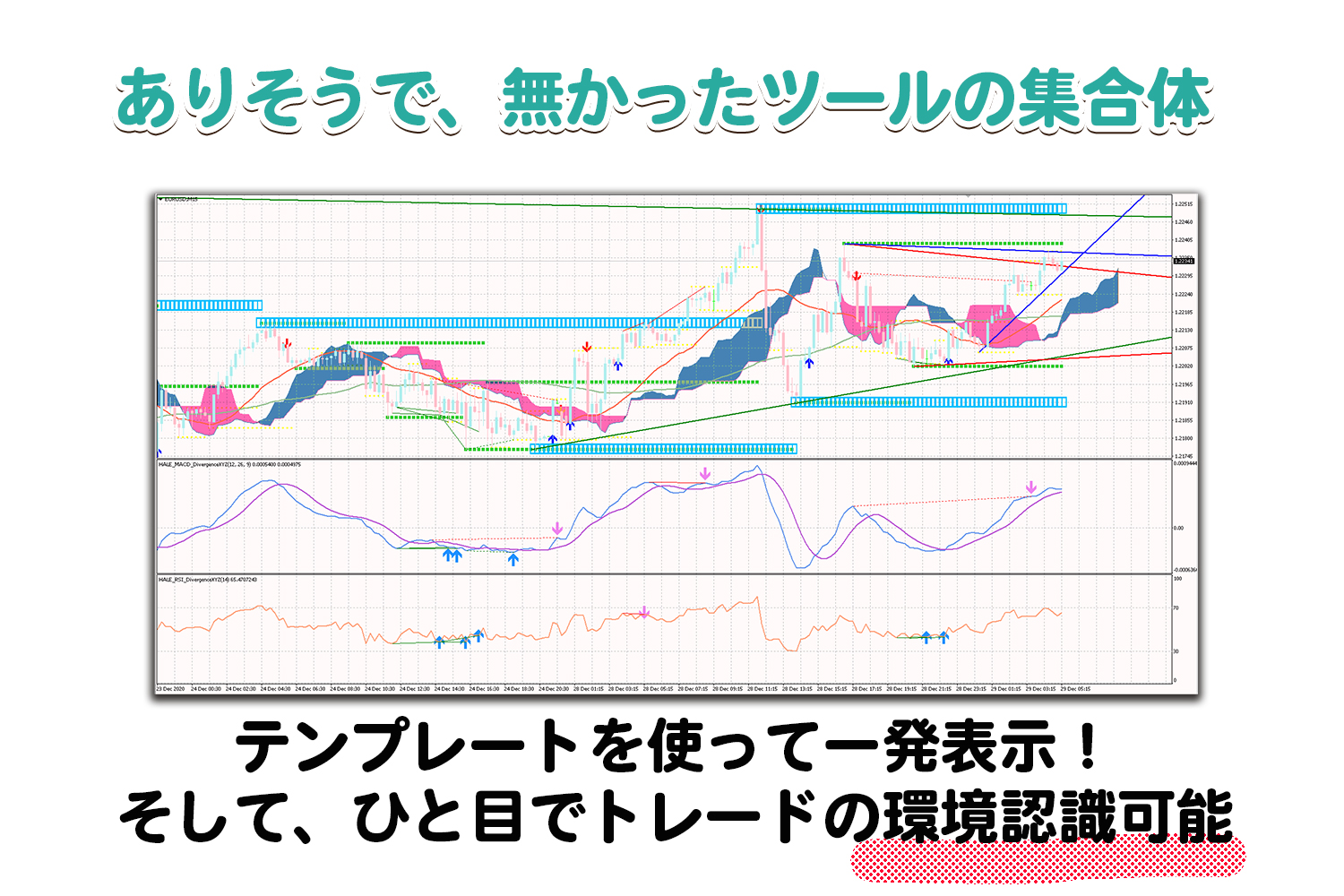 それが、【高勝率!こんなの欲しかった!トレード大全インジケーター】です。