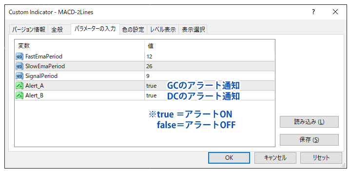 MACDを2本線表示+GC・DCを通知する「MACD-2Lines」