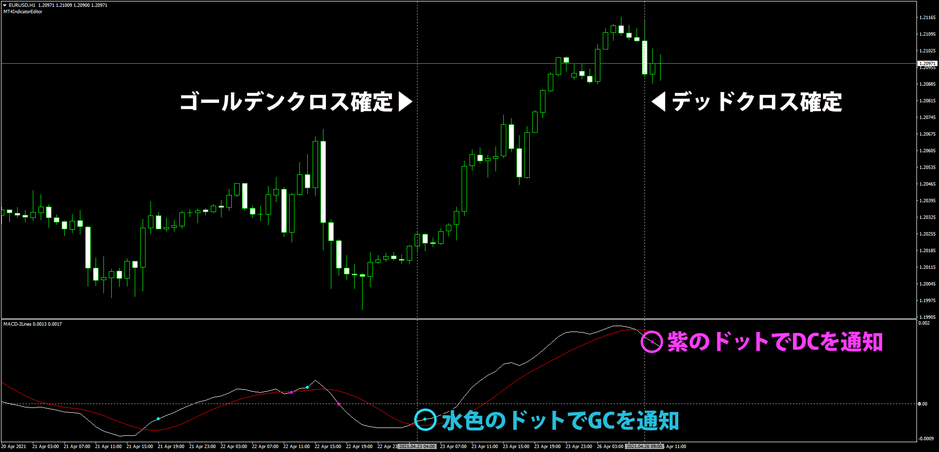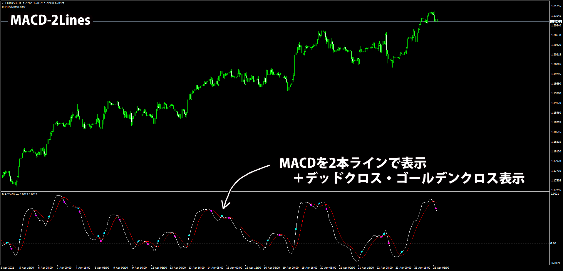 「MACD-2Lines」は、MACDを2本線で表示+GC・DCを通知してくれるMT4用インジケーターです。