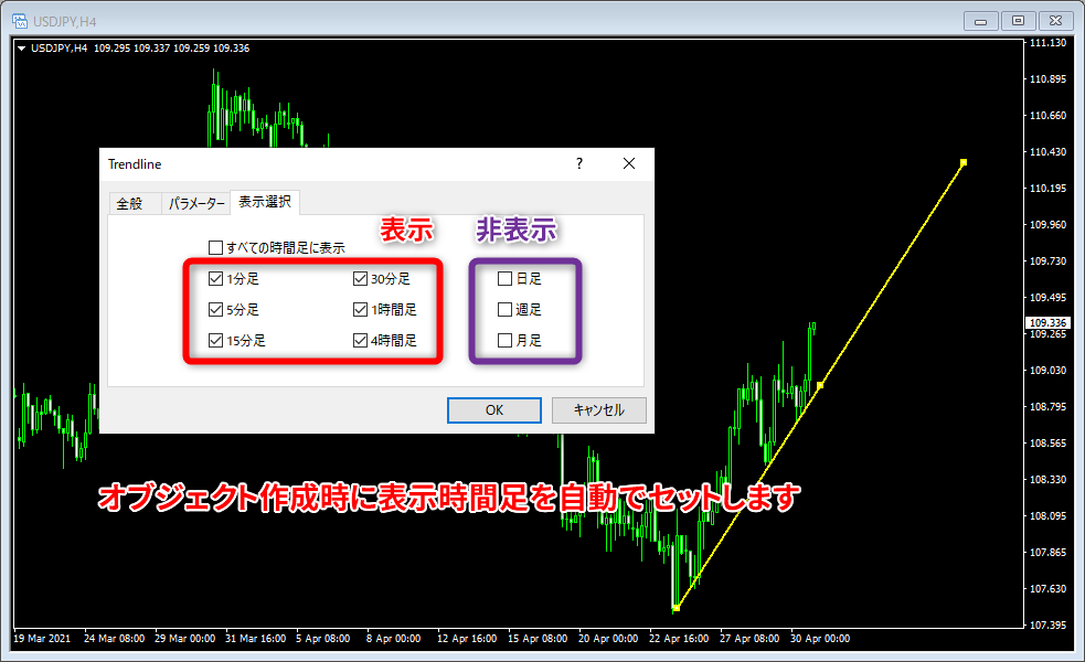 ・ラインを引くとそのラインの表示時間足が自動でセットされます。 ・1分足や5分足などの下位時間足で引いたラインが上位足チャートでは非表示にできるのでチャートがスッキリします。 ・オブジェクトの生成時間足ごとに表示時間足のルールを設定できます。対象オブジェクト