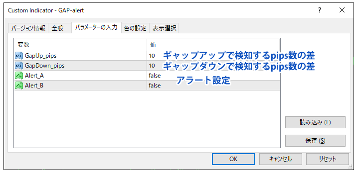 パラメーター設定は、窓開けを検知するpips数とアラート設定のみです。