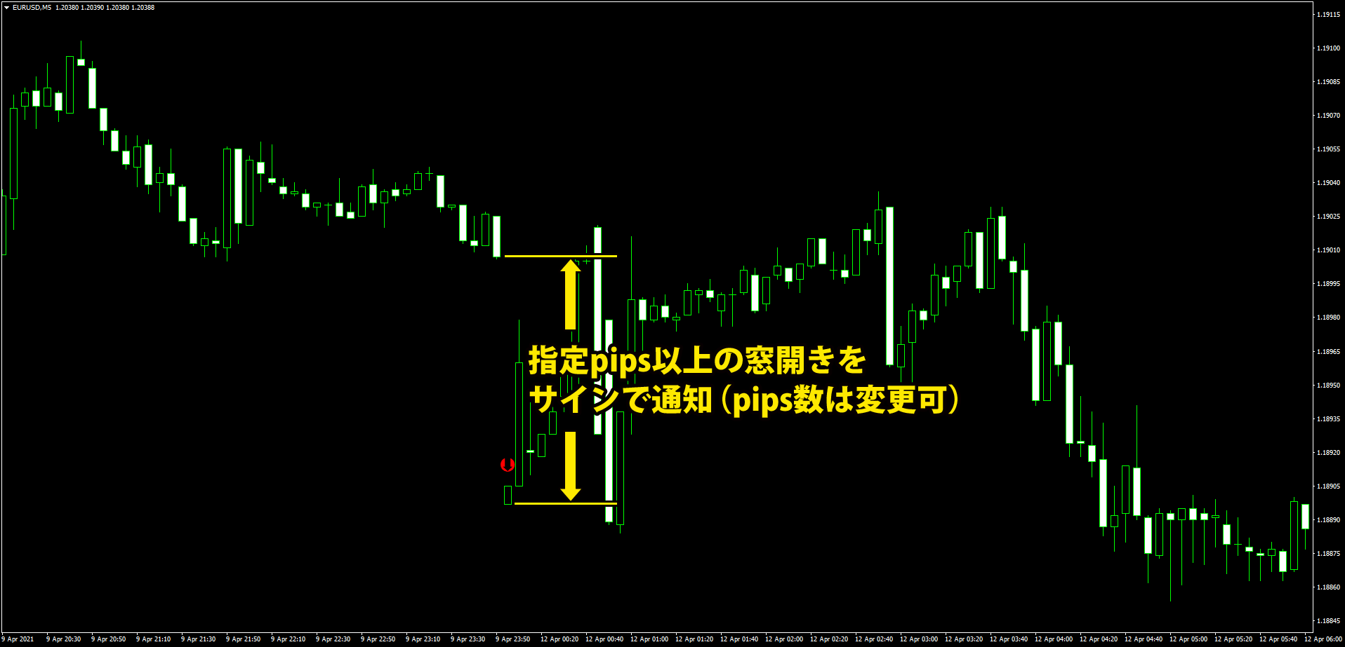 任意で指定したpips以上の窓開けを検知する仕組みです。