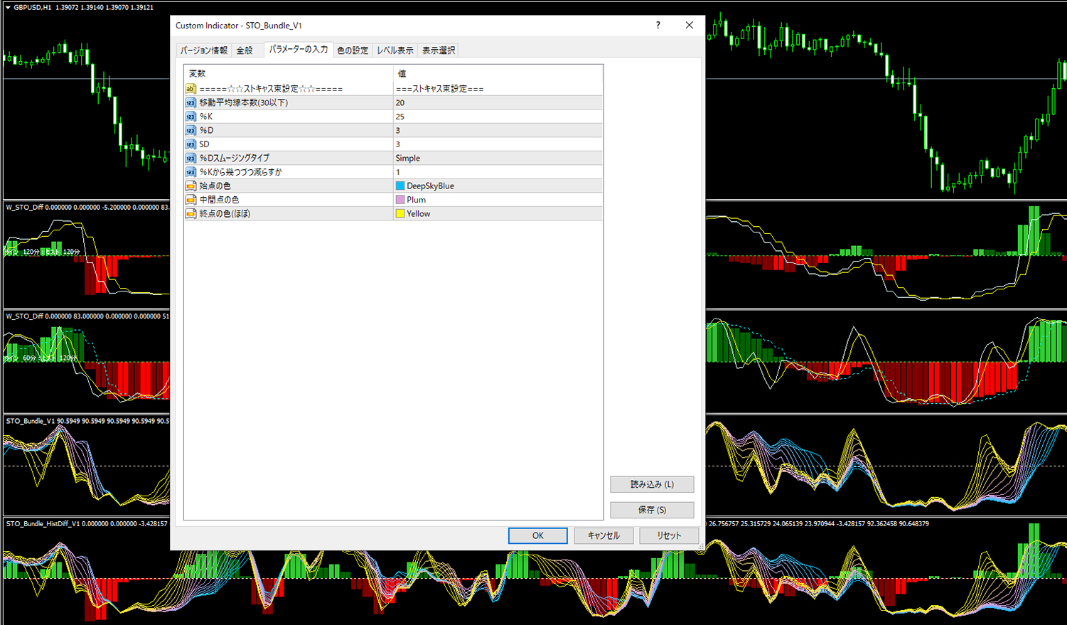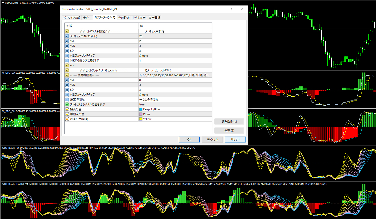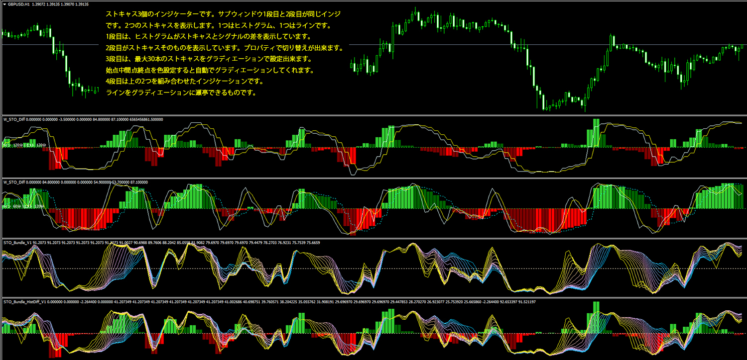 下記画像のサブウィンドウ1段目、2段目は、W_STo-HistDiff_V1というインジです。