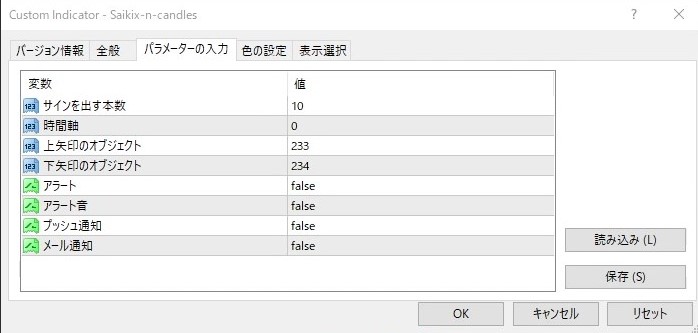 「Saikix-n-candles.ex4」はN本連続で陽線・陰線が出現するとシグナルをMT4に表示する無料インジケーターです。