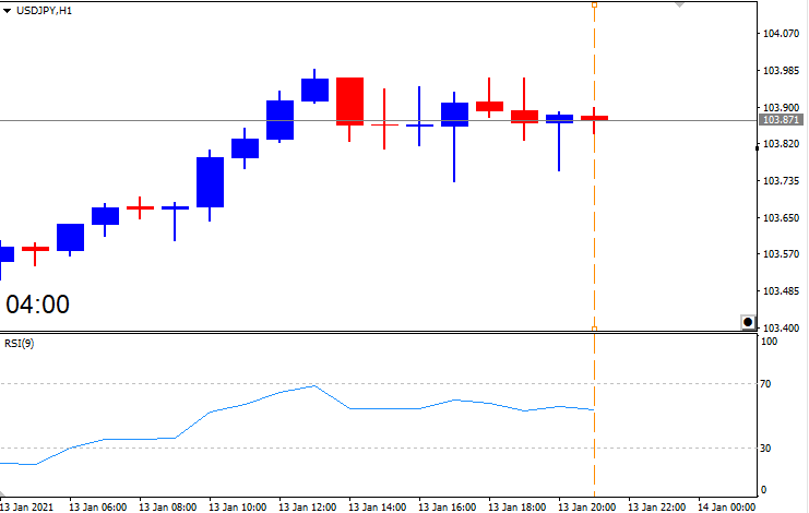 MT4VT_Chartとの連動専用でチャートにインジケーターを導入すると、垂直線より右側が非表示のRSIが表示されます。 表示が確定足ベースで、下位足を動かしたときは1本前までを表示します。