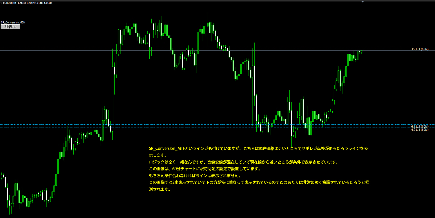 サポレジの重なりを検索して多い順から水平線を自動描画!サポレジ転換ラインも自動描画!2つのインジをセット!