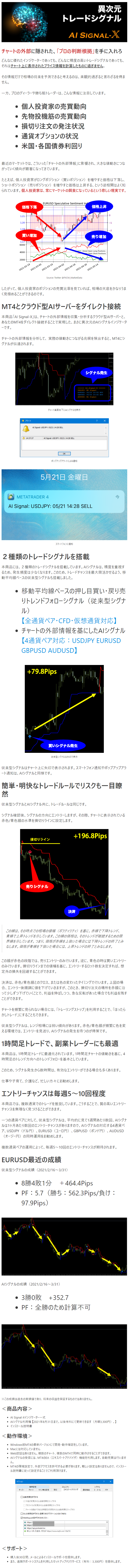 チャート上の情報だけから発生させる「旧来型」売買シグナルには限界があります。相場のプロの「判断根拠」をクラウド型AIが収集・分析して売買シグナルをあなたにお知らせ。