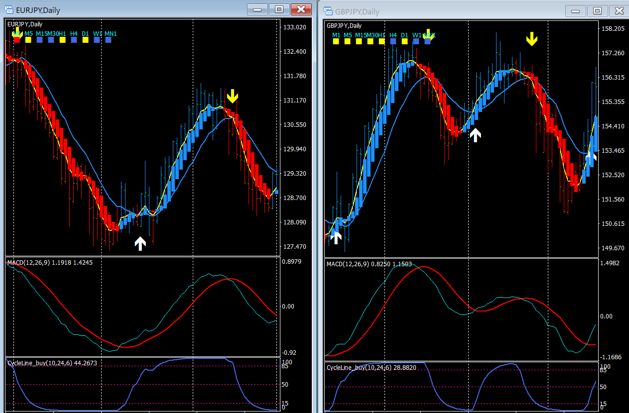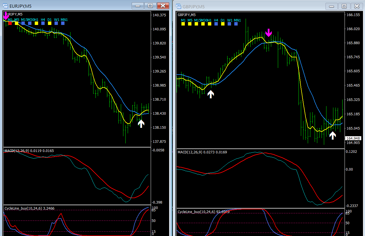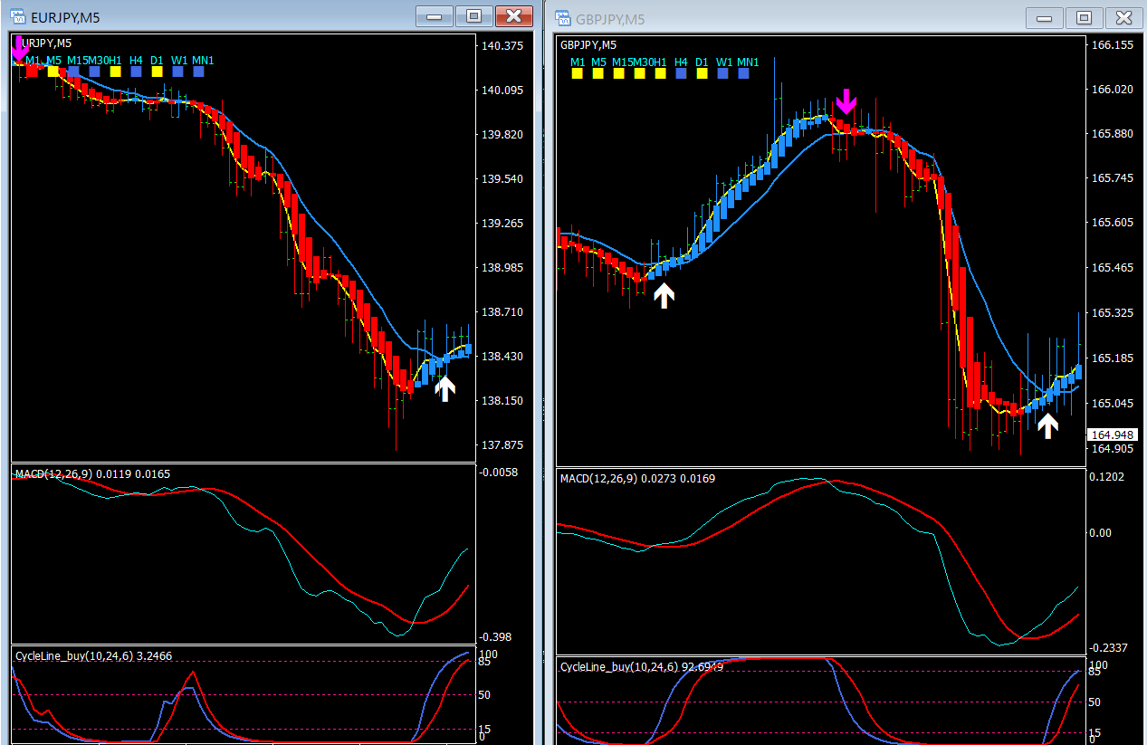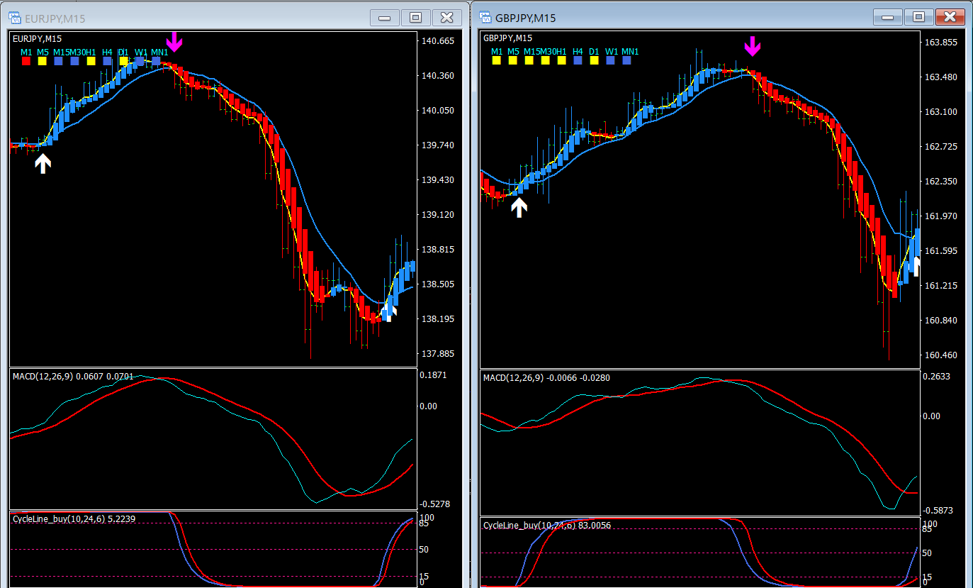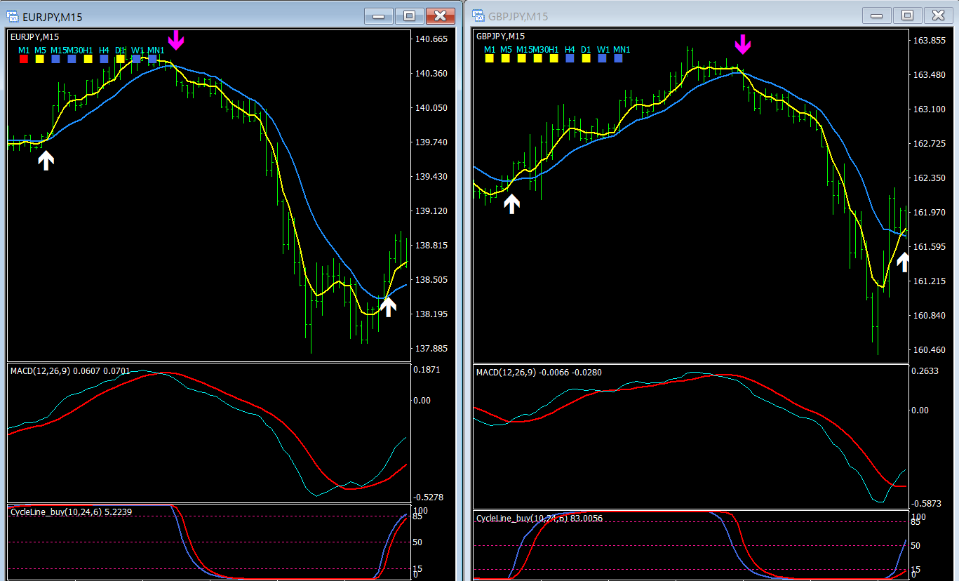 EURJPY  GBPJPY  M15      MACDなどと平均足を入れてみました。