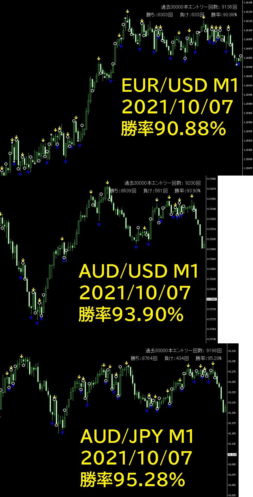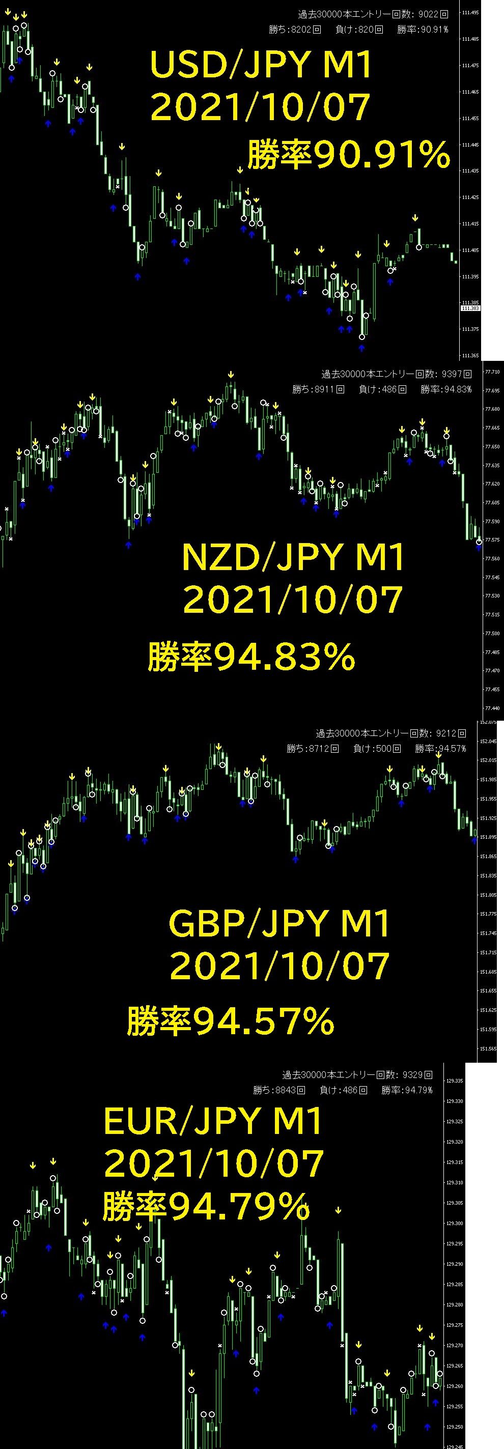 ※別のバックテスト結果で、サインからみて次足エントリー(30秒~1分に相当)/同じく次々足/同じく次々々足(3分に相当)の結果をシミュレートした場合の勝率(%)です(あくまで参考程度にお考え下さい)