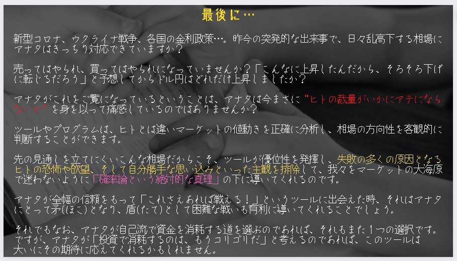 もう聖杯探しは終わりです!!現役プログラマー・トレーダーが自信を持ってご提供するこだわりの逸品!!