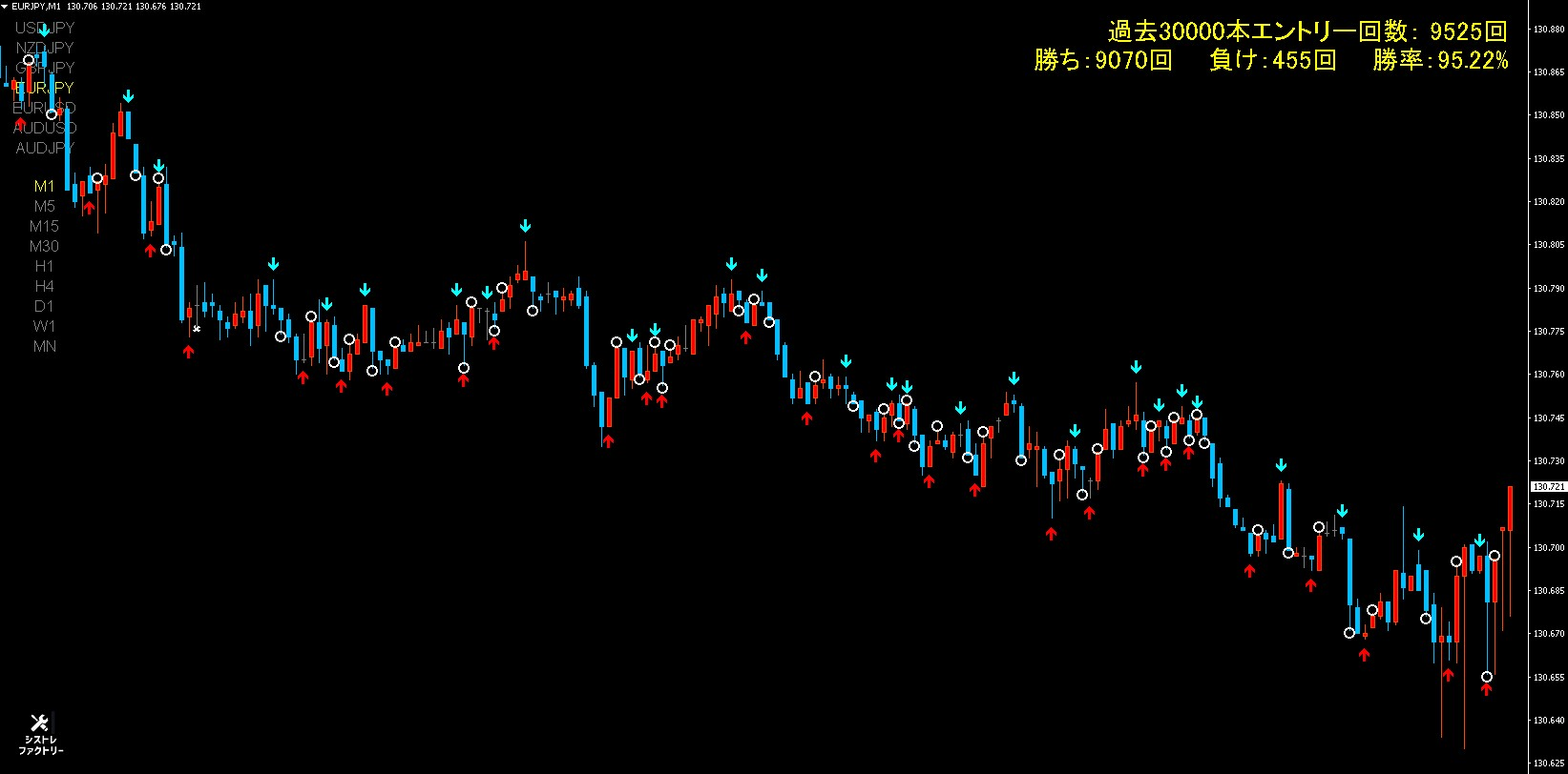 次の画像はサインから見て次足エントリーした場合のバックテスト画面・結果です(あくまで参考程度にお考え下さい)