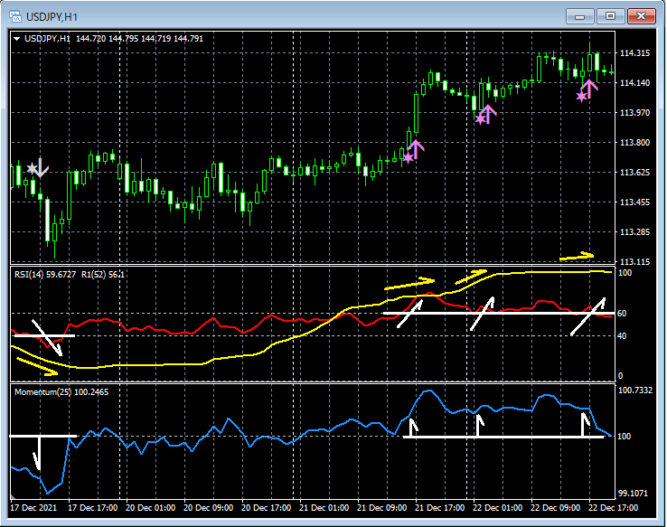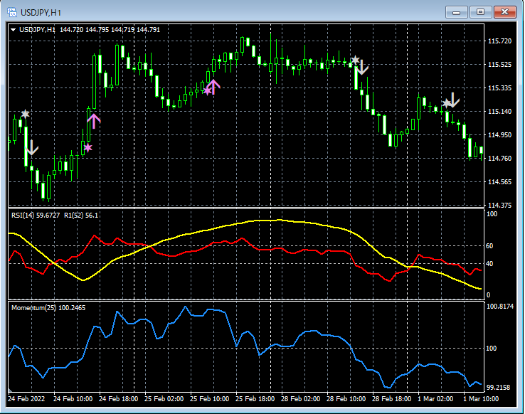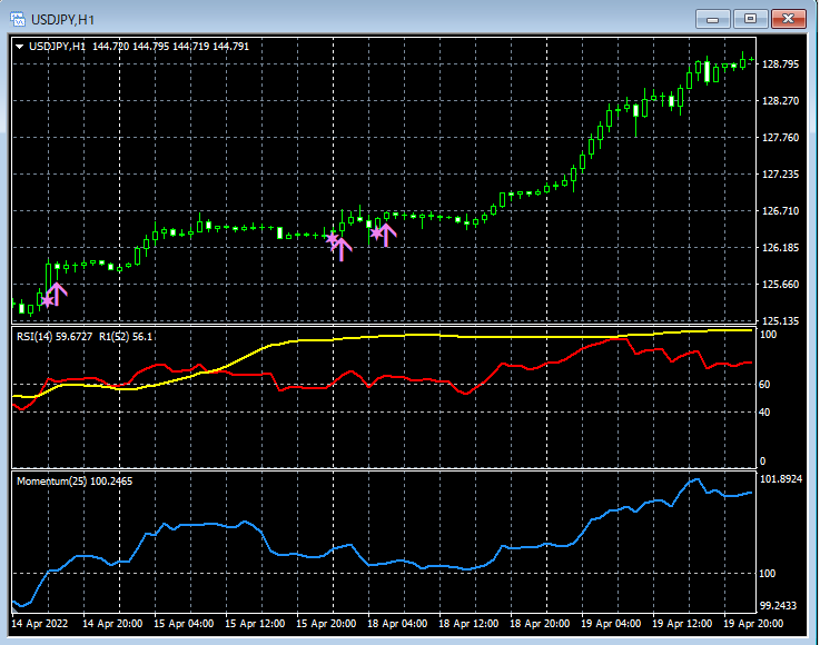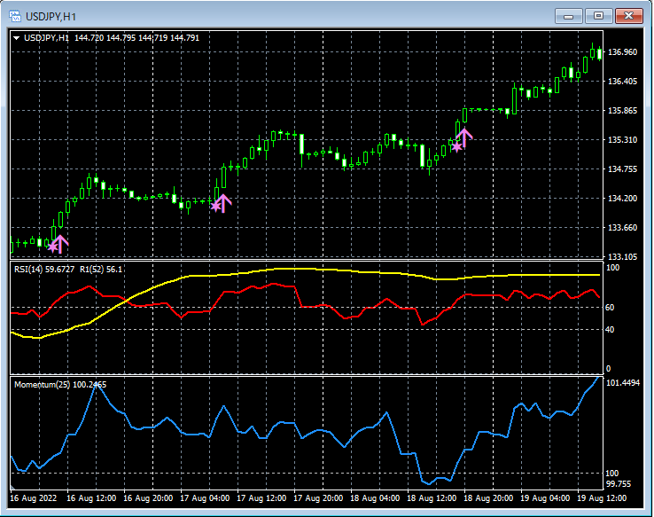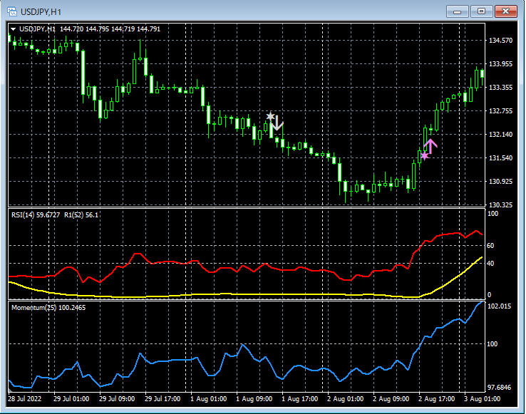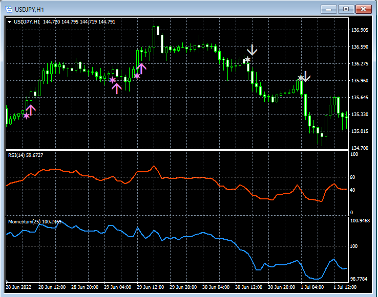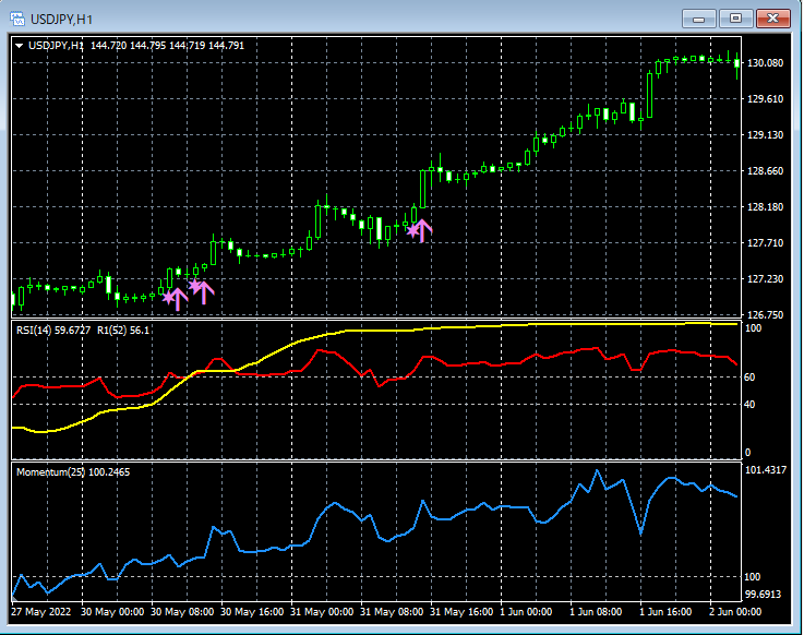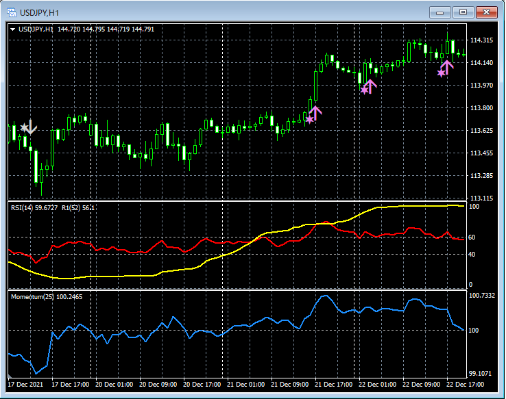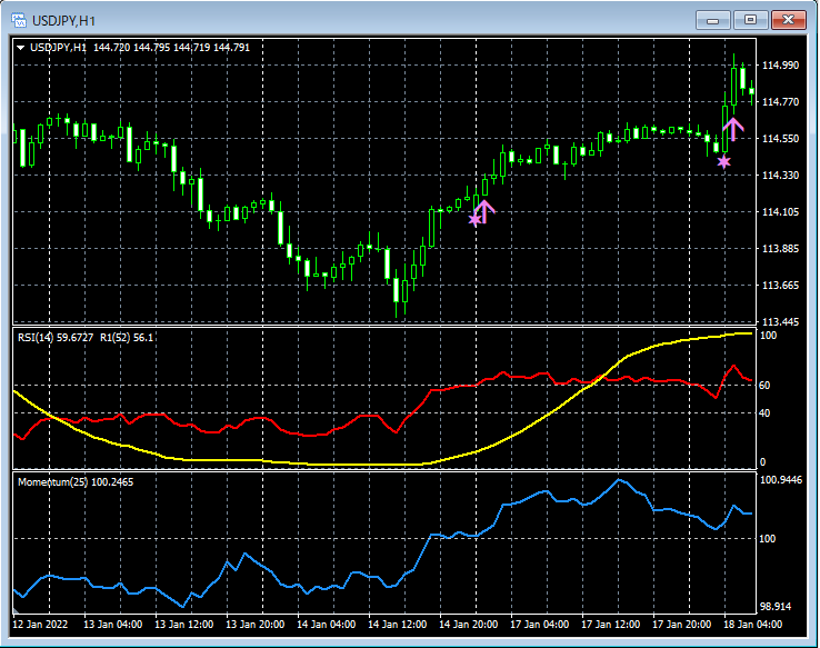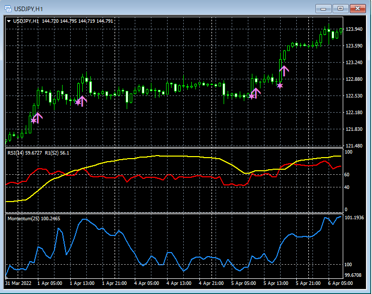 RSIMOMのサインの例 ドル円1時間足(設定を変更したもの) 2022年10月1日追加