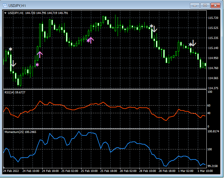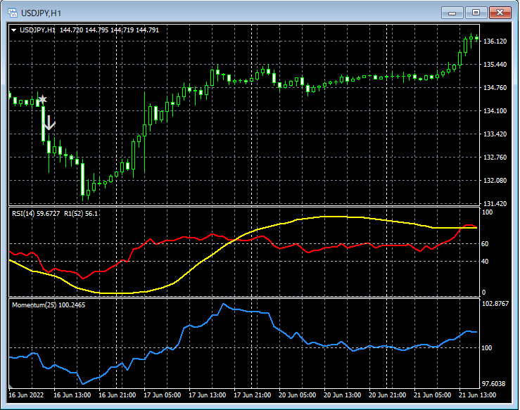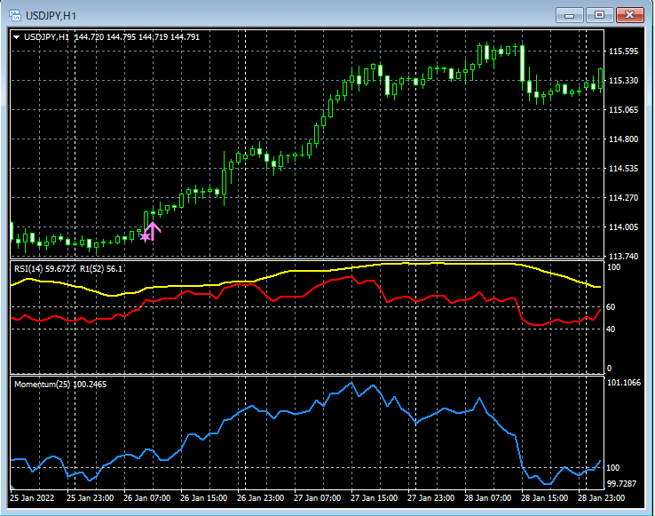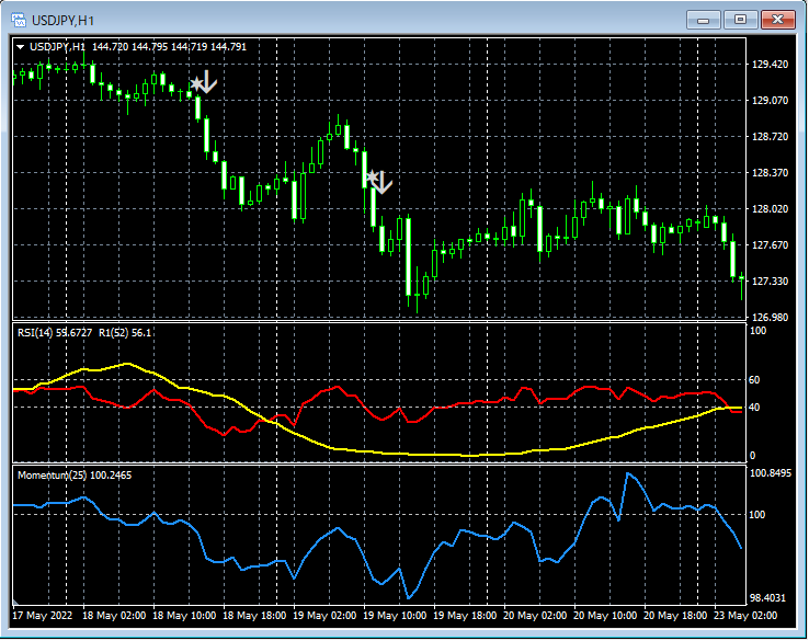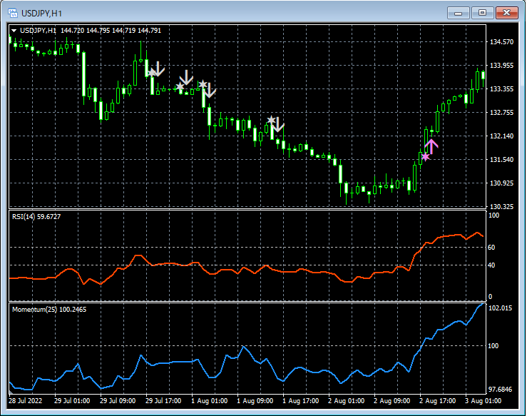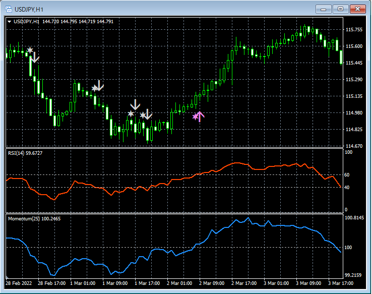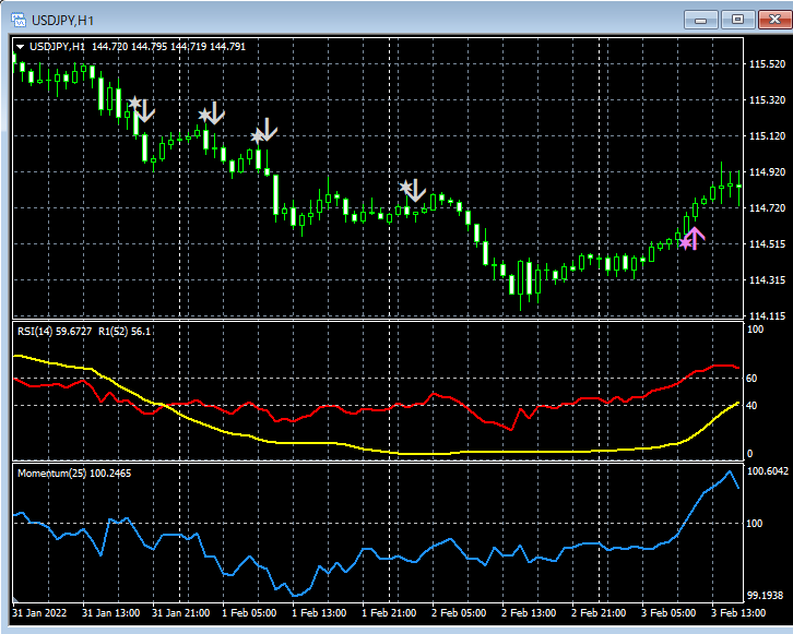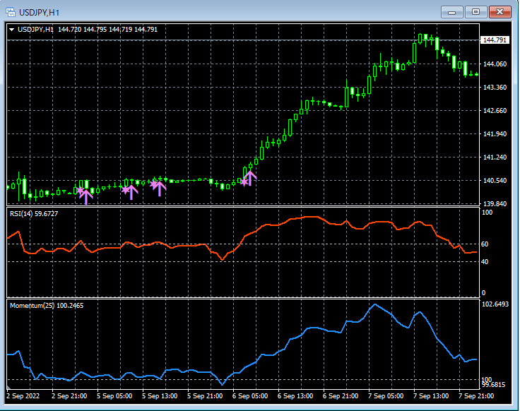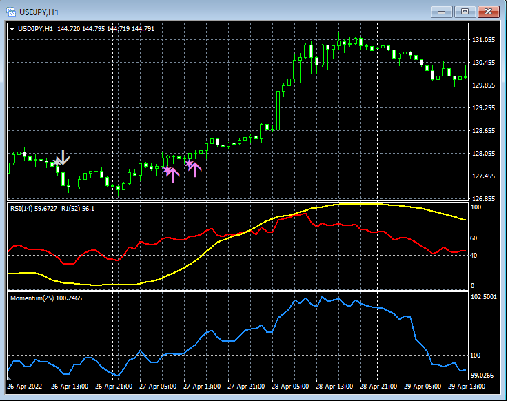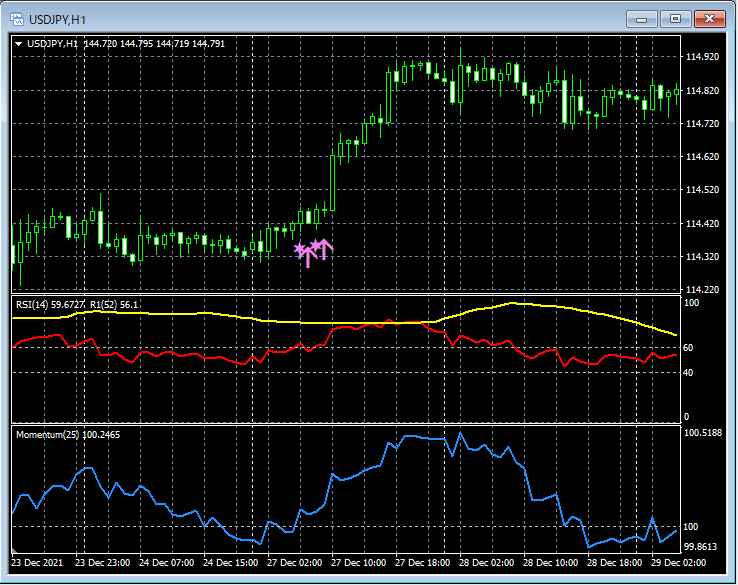 RSIMOMのサインの例 ドル円1時間足(設定を変更したもの) 2022年10月1日追加