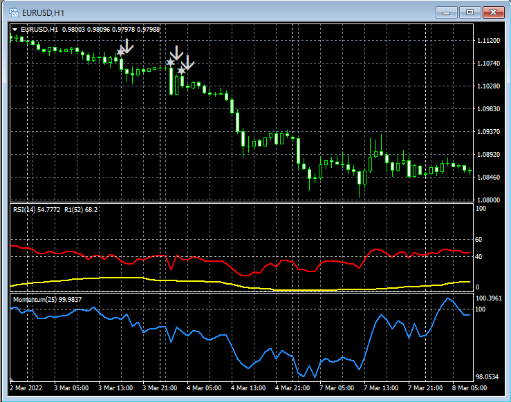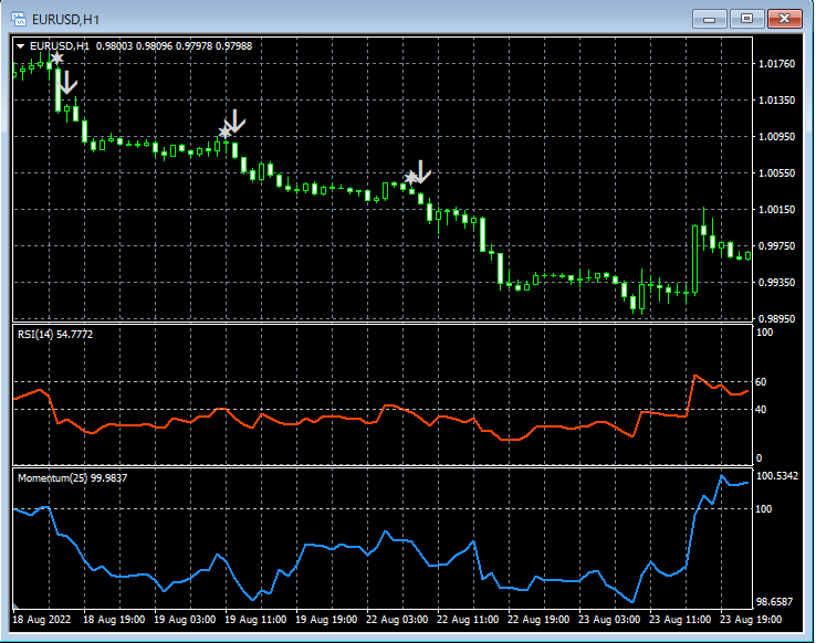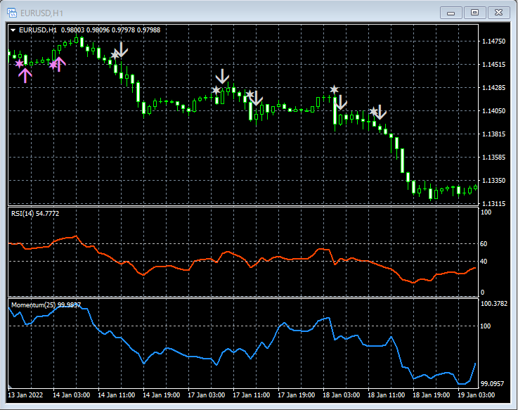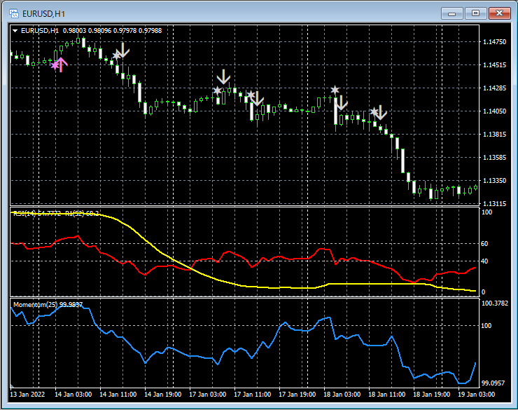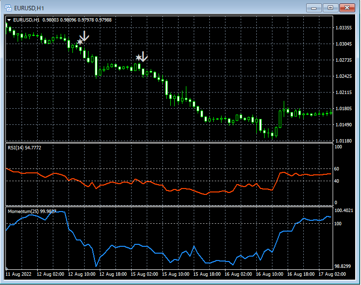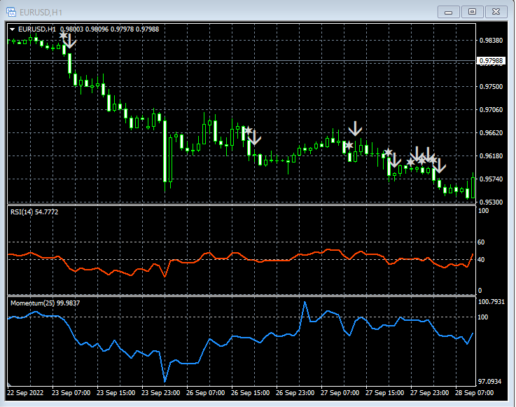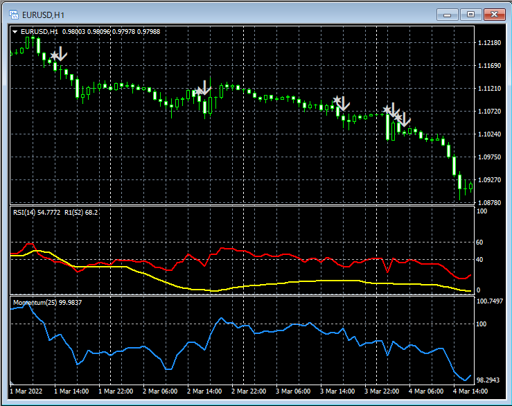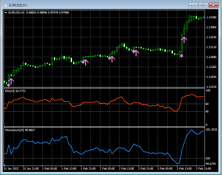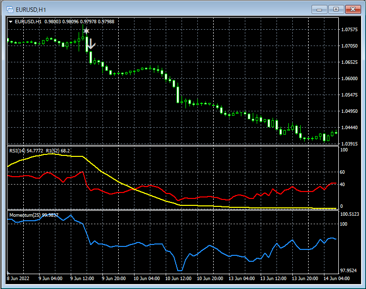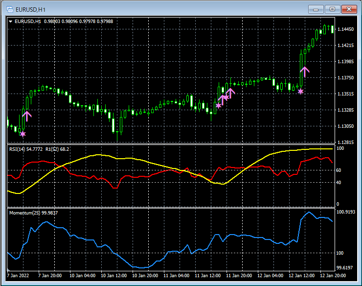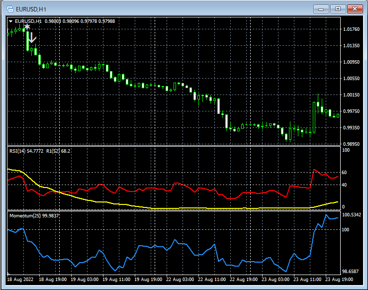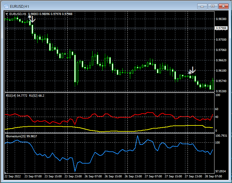 RSIMOMのサインの例 ユーロドル1時間足(設定を変更したもの) 2022年10月1日追加