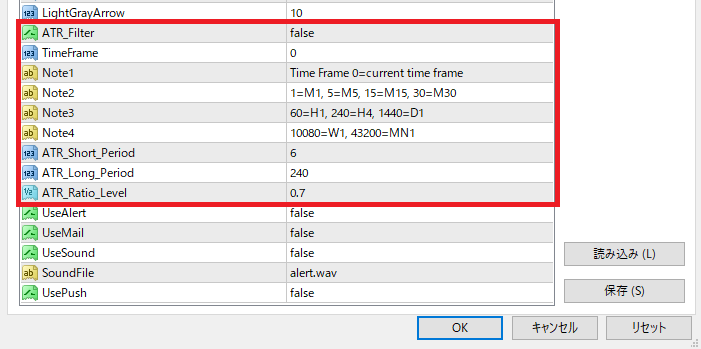 本商品に含まれる矢印インジケーターについては、ボラティリティ(値動き)の小さな相場を避けることを目的として、ATR比を使ったマルチタイムフレーム対応のボラティリティフィルターが実装されています。