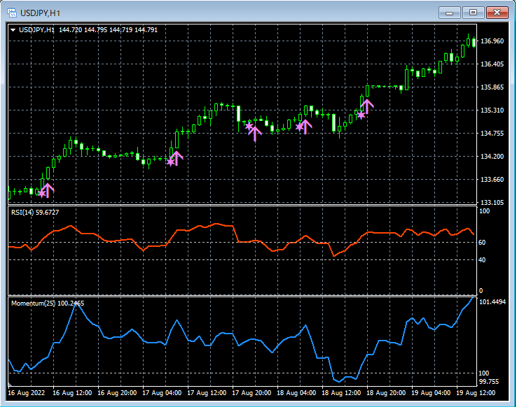 この矢印インジケーターのコンセプトは、「大きなの流れはモメンタム(とRCI)で判断し、短期的な流れはRSIで判断しエントリータイミングをはかる」というものです。