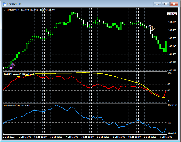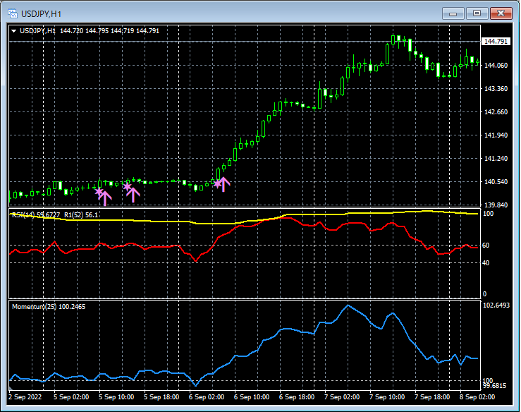 ◆RSIMOMのサインの例 ドル円1時間足(設定を変更したもの) 2022年10月1日追加
