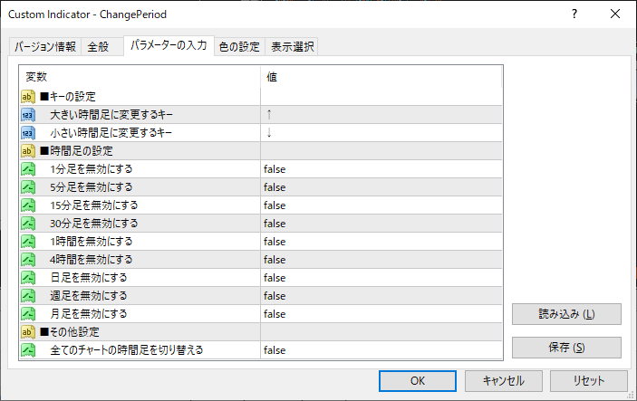 デフォルトは「↑」で大きい時間足、「↓」で小さい時間足に変更できます。