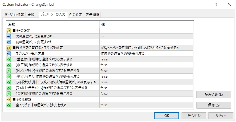 - true: キー入力による通貨ペアの切り替え時に表示している全てのチャートの通貨ペアを切り替える