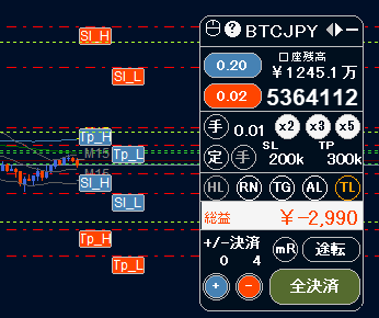■SL TPは一括、個別設定切替機能付き、一括時はチャート上ライン、及びパネルデータにて設定できます。