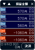 損益がプラスまたはマイナスのポジションを決済(途転)買ポジションまたは売ポジションを決済(途転)  損益プラスまたは損益マイナスのポジションを決済(途転)エントリー価格が最も高いまたは低いポジションを決済。