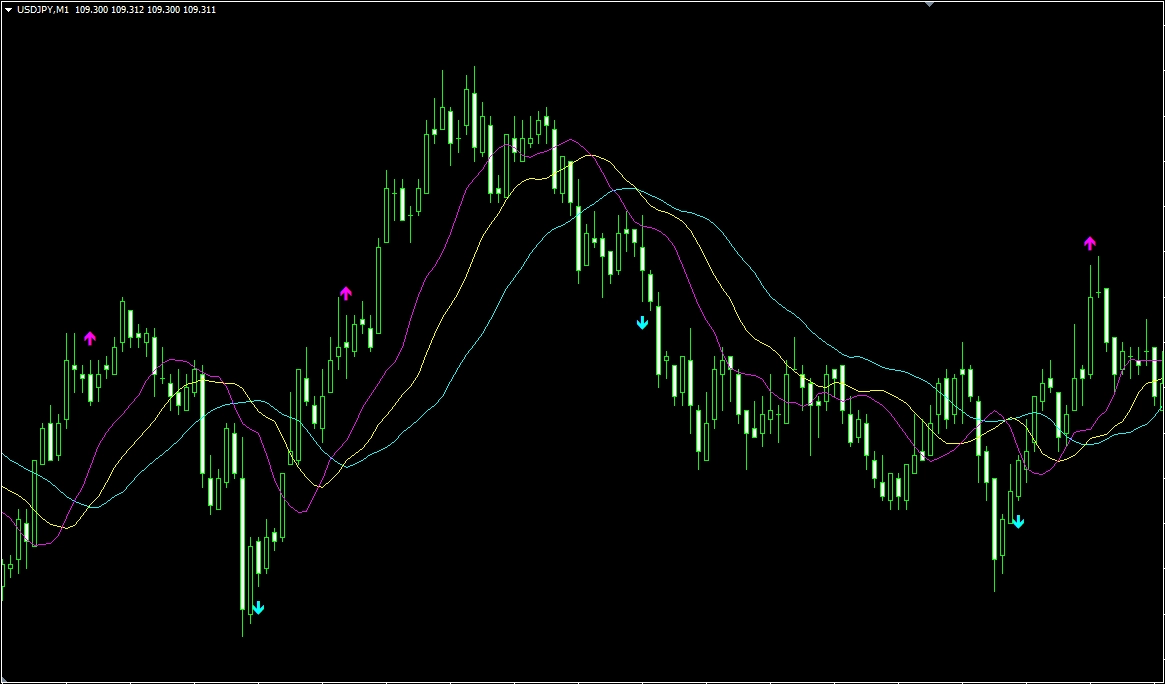 3本のラインとクロスしたローソク足での上下矢印が表示されます。