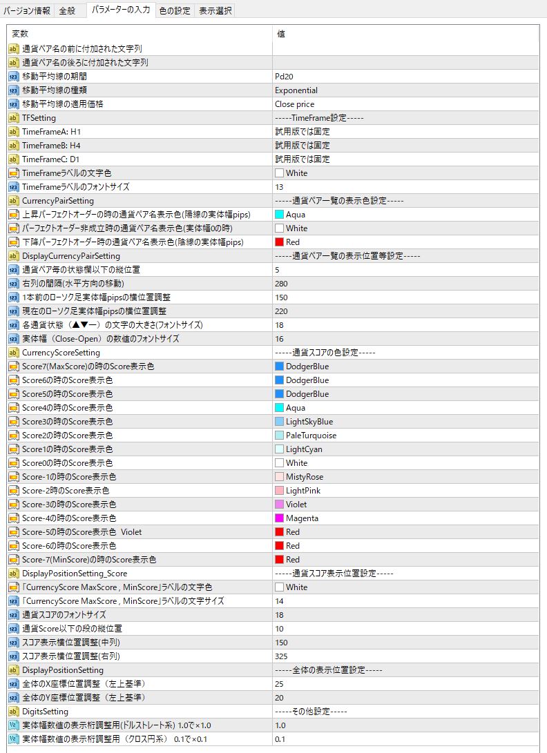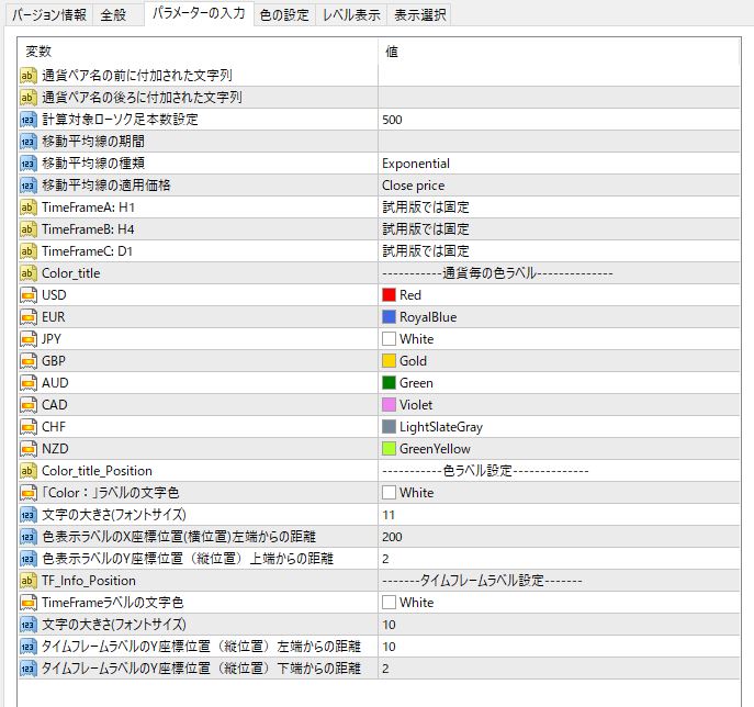 通貨毎のラベルの色はこの「パラメーターの入力」タブ内の設定で変更できますが、