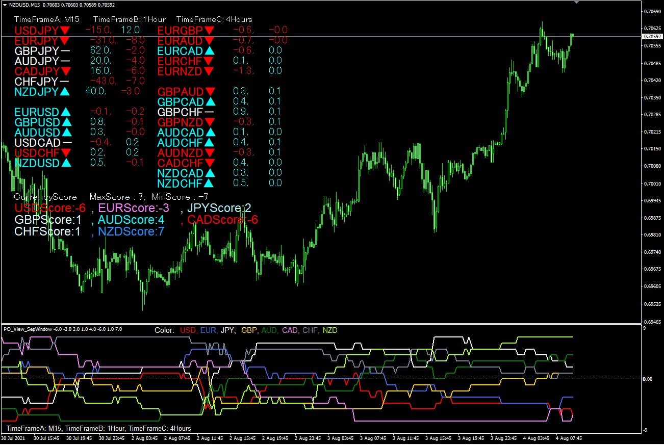 当インジケーターセットは、チャートウインドウに全通貨監視、通貨強弱スコア表示を行う「PO_CurrencyScore」と、サブウインドウで通貨強弱の推移を時系列で追う事ができる「PO_CurrencyScoreChart」の2つがセットになっています。 また、どちらも単体で使用することができます。PO_CurrencyScore