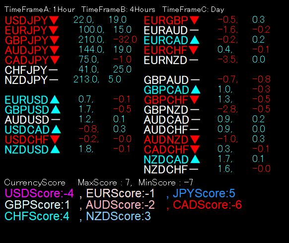 具体的には、EURUSDで下降パーフェクトオーダー(以降パーフェクトオーダーをPOと表記します)が成立していれば「+1点」、USDJPYは上昇POで「+1点」、GBPUSDは下降POで「+1点」、AUDUSDは下降PO、USDCADとUSDCHFは上昇PO、NZDUSDは下降POでそれぞれ「1点」、合計で7点という具合です。