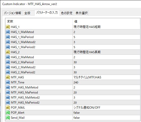 ▶ 設定例(画像参照) 1、4時間足チャートのHASトレンド方向に出た矢印のみ採用する(MTFフィルター)。 2、1時間足チャートで2本のHASが揃ったタイミングで矢印表示する。 2019-08-26_11h11_21.png 上に掲載したチャート画像では、 4時間足チャートのHAS、1時間足チャートの2本のHAS、合計3本のHASが