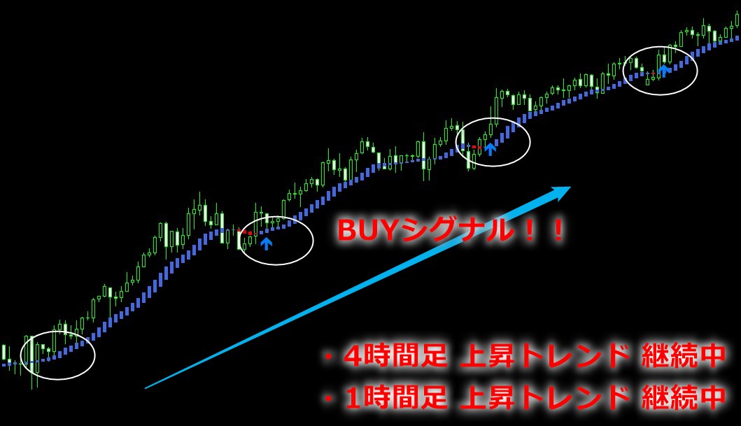 →4時間足および1時間足チャートの平均足スムーズドが上昇トレンド継続中