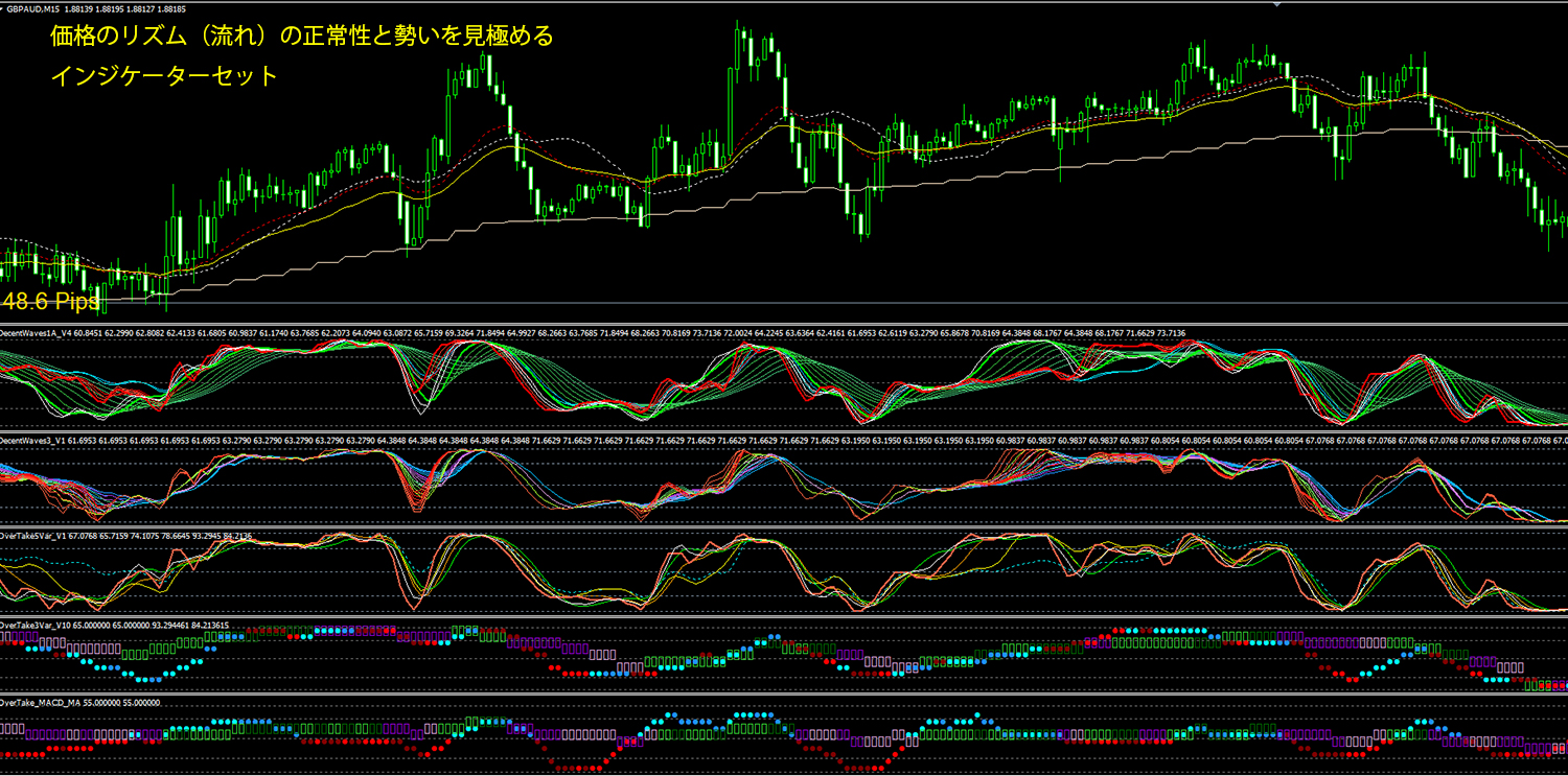 上の画像のインジケータ達が、価格の流れを検知するインジケーターです。