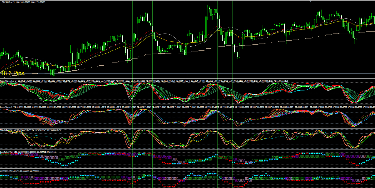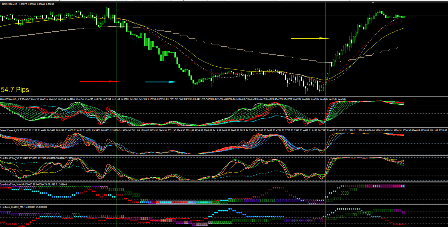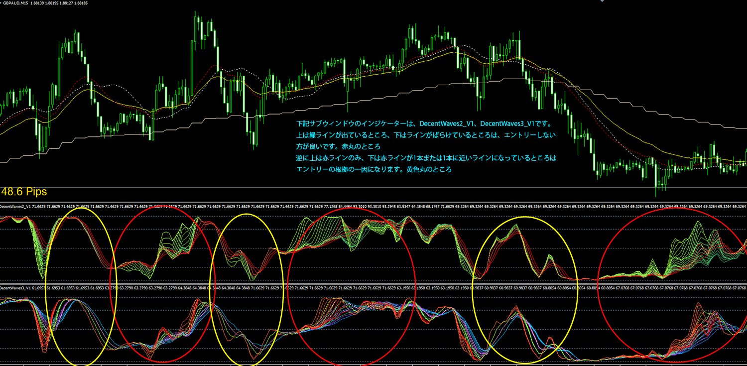 DecentWaves1は、赤ラインが白、緑ライン達より早く動いている時(赤ライン白ライン緑ラインの順)または一緒に動いている時が、価格のリズムが正常に動いているときとします。上の上の画像の黄色丸のところです。