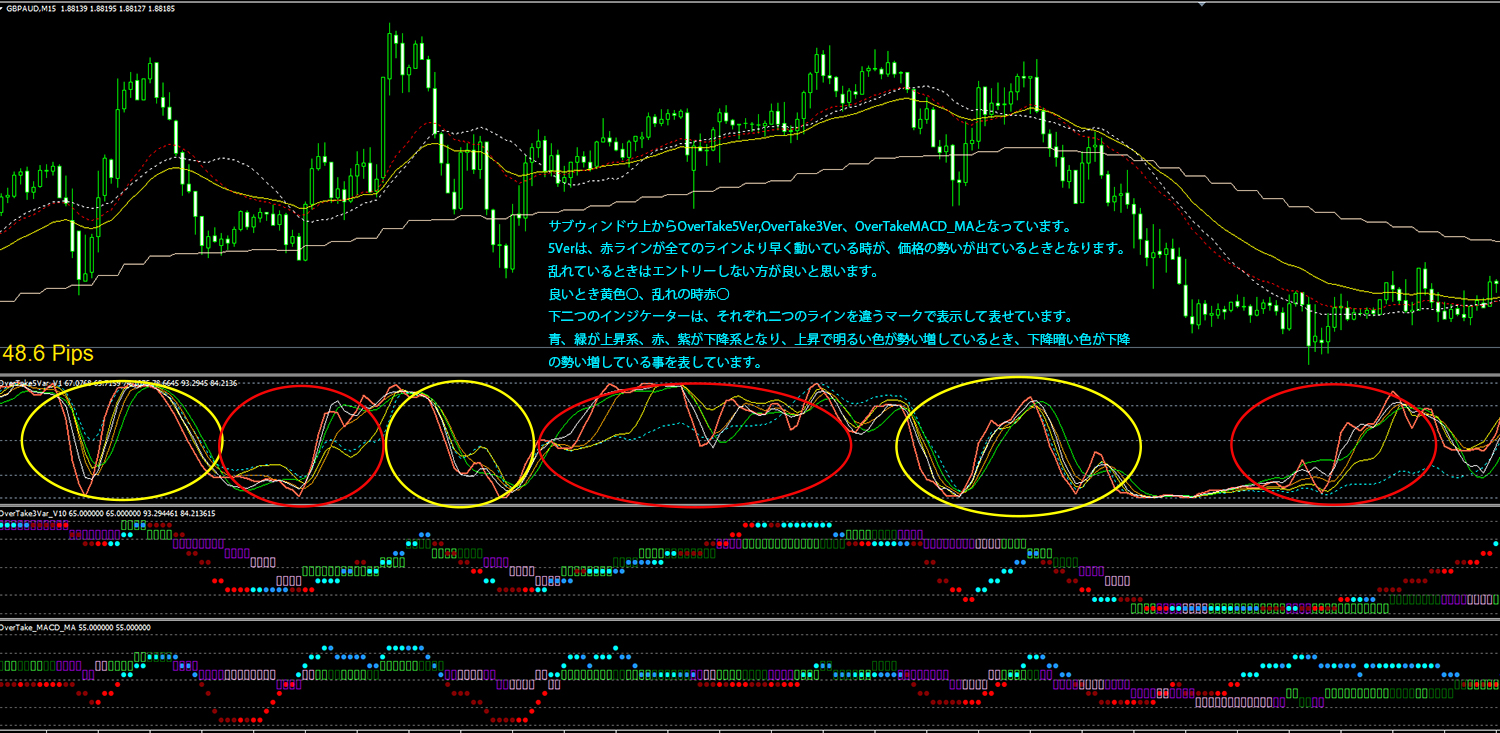 一番上のOverTake5Verは、赤ラインが他の全てのラインより早く動いているところ、黄色丸のところです。