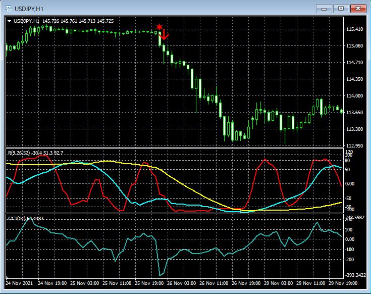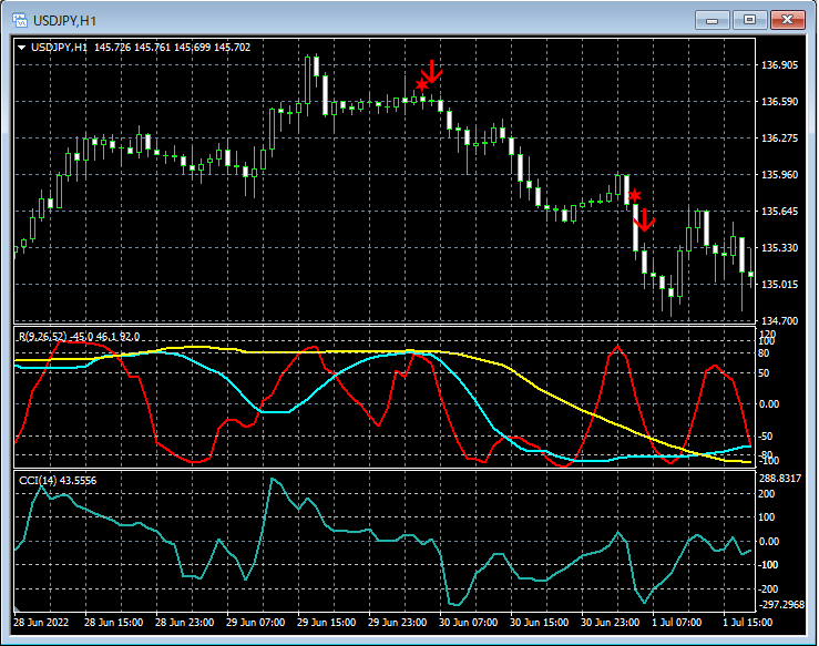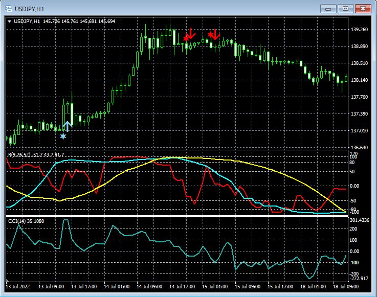 RCI3本ラインが下向きにそろっていない状態にあるローソク足の次のローソク足でRCI3本ラインの方向が下向きにそろった時に、CCIがゼロラインより下にあるならば、赤色の星印が点灯します。
