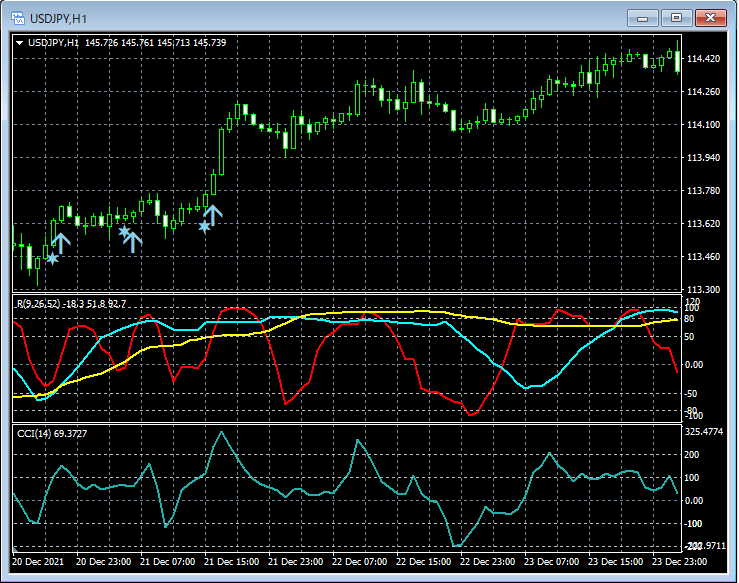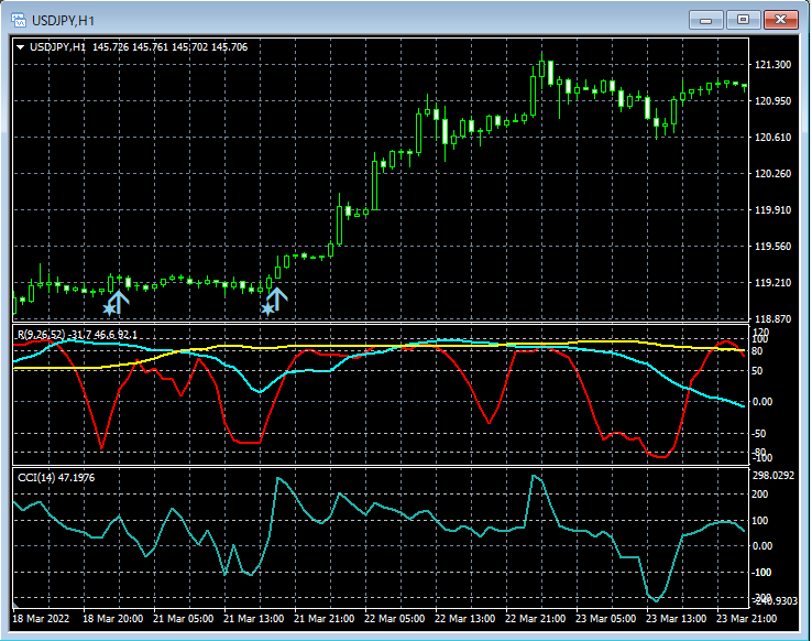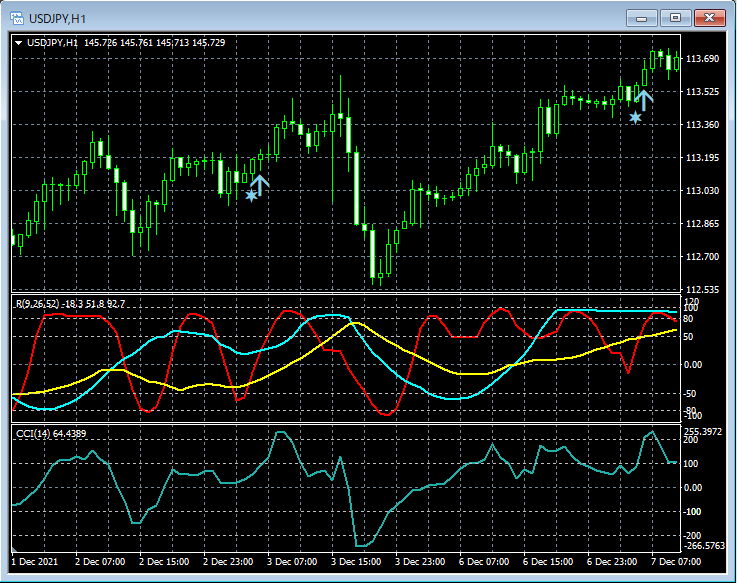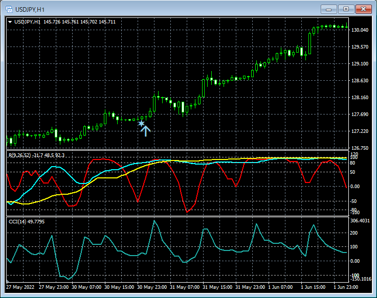 RCI3本ラインが上向きにそろっていない状態にあるローソク足の次のローソク足でRCI3本ラインの方向が上向きにそろった時に、CCIがゼロラインより上にあるならば、空色(スカイブルー)の星印が点灯します。